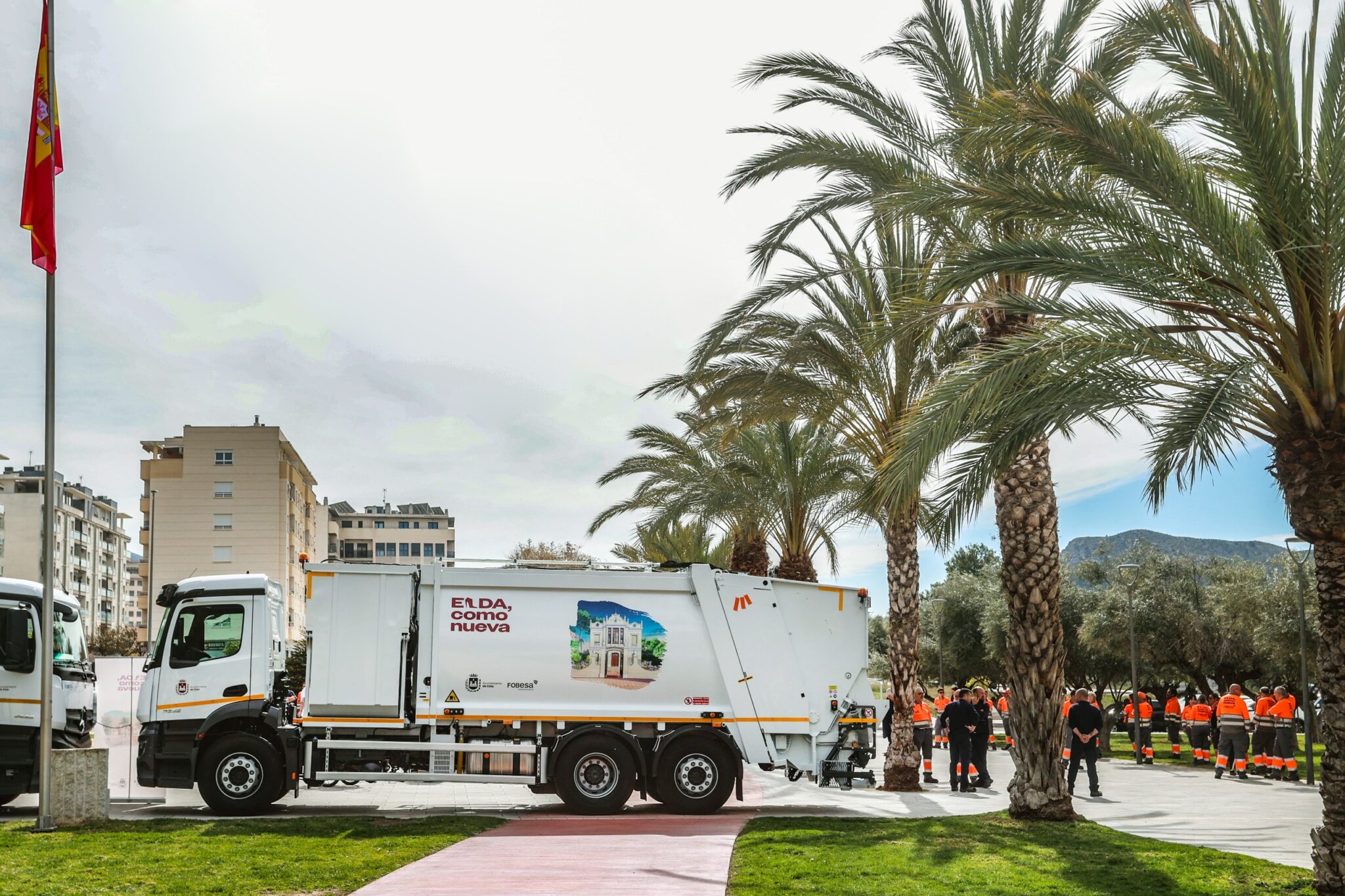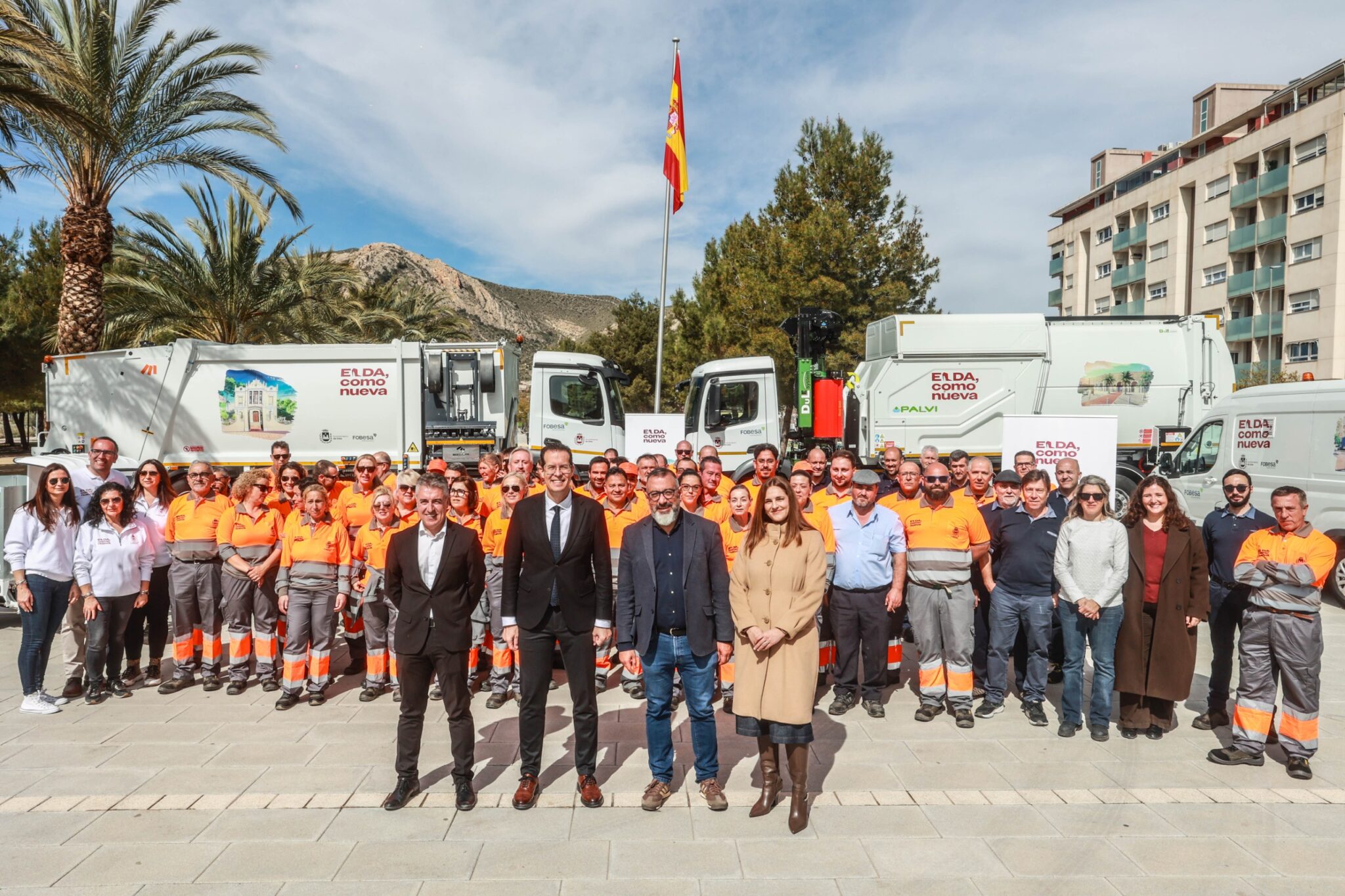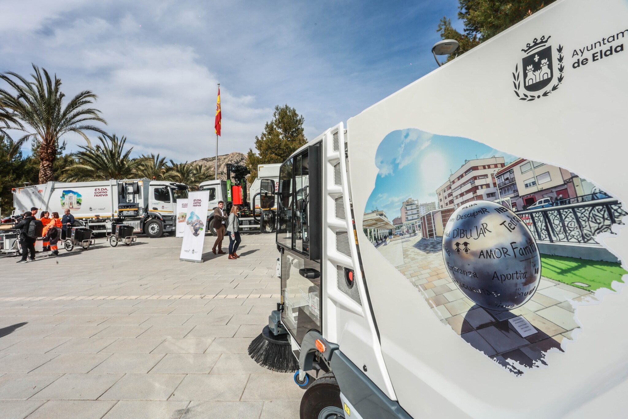 El lema de la nueva contrata es ‘Elda como nueva’, que va rotulado en todos los vehículos, contenedores y ropa de trabajo. La nueva imagen visual incorpora hitos y espacios públicos de nuestra ciudad que son muy especiales y muy queridos por todos los y las eldenses.