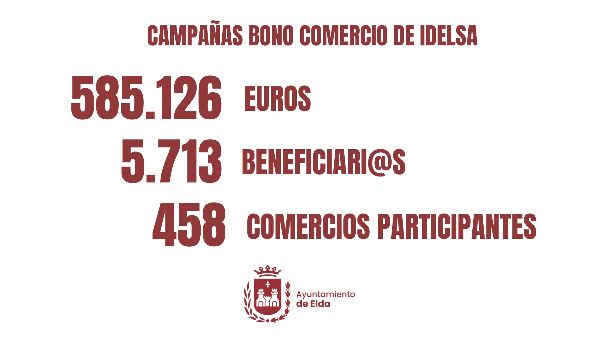 Por otro lado, las tres campañas de Bono Comercio puestas en marcha por la Concejalía de Comercio y Mercados con fondos del Ayuntamiento de Elda y de la Diputación de Alicante beneficiaron a 5.713 usuarios y usuarias y permitieron inyectar 585.126 euros para compras en el comercio de proximidad de Elda. En estas tres campañas participaron un total de 458 establecimientos comerciales.