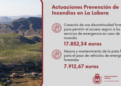 Las actuaciones se enmarcan dentro del Plan Local de Prevención de Incendios y han consistido en la creación de una discontinuidad forestal para permitir el acceso seguro a los servicios de emergencia en caso de incendio (17.852 euros) y en la mejora y mantenimiento de la pista forestal para el paso de vehículos de emergencias forestales (7.912 euros).