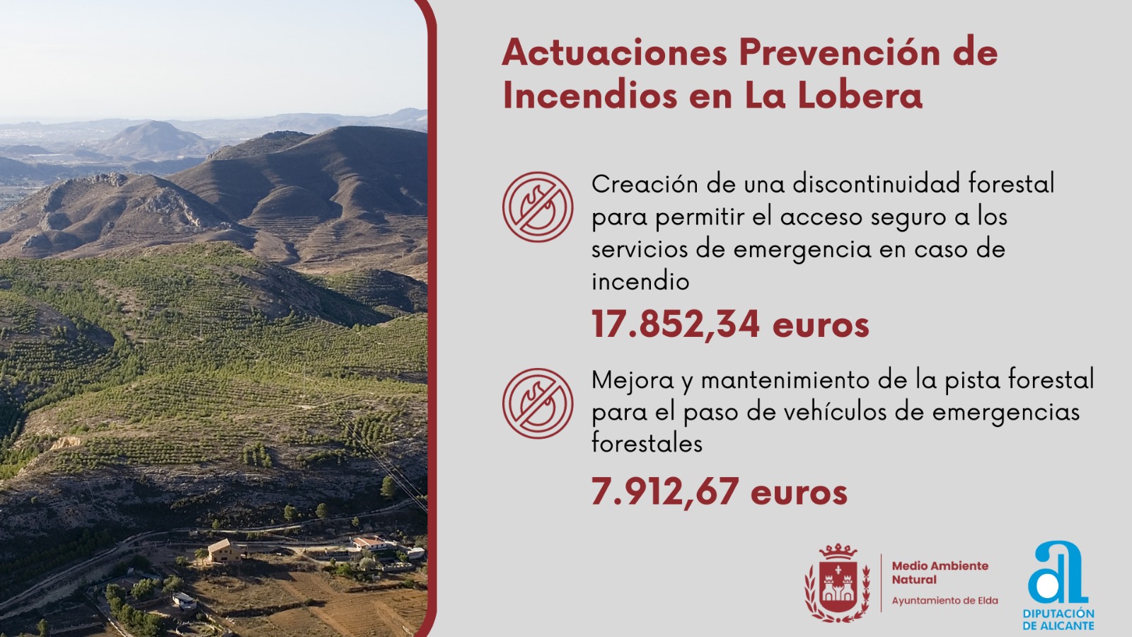 El Ayuntamiento de Elda, a través de la Concejalía de Medio Ambiente, llevará a cabo labores de prevención de incendios en la pista forestal La Lobera con fondos procedentes de una subvención de 25.765 euros de la Diputación de Alicante.
