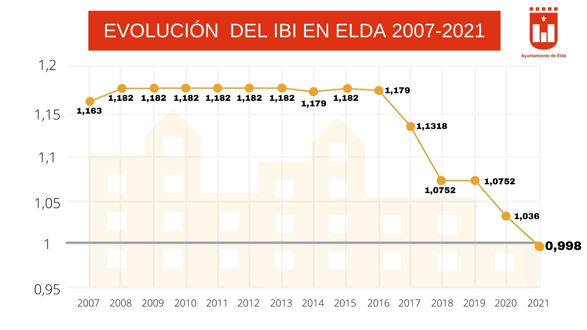 El alcalde de Elda, Rubén Alfaro, ha anunciado hoy la reducción del tipo impositivo del Impuesto de Bienes Inmuebles (IBI), que por primera vez en los últimos 25 años se sitúa por debajo del 1%. Desde el año 2016, este porcentaje ha pasado del 1,182% al 0,998%, lo que supone una reducción del 18,5% en cinco ejercicios.