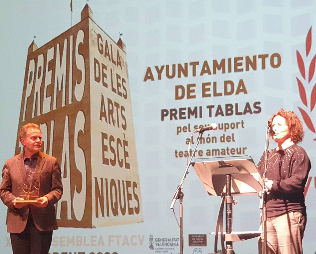 Los Premios Tablas son un reconocimiento que la Federación realiza desde hace 20 años a las entidades y personas por su esfuerzo y labor de apoyo al teatro amateur. Este año, además del Ayuntamiento de Elda, han sido premiados también el Grupo Ágora, de Carcaixent, con mención especial por su dilatada trayectoria; Pilar Martínez y Mario Máñez, y el actor Alfred Picó, por su vinculación al teatro amateur.