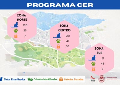 El programa CER se está desarrollando en Elda con un modelo de alta intensidad que combina la formación de personas responsables de las colonias con intervenciones veterinarias continuadas y un seguimiento exhaustivo. En este marco se han llevado a cabo sesiones formativas específicas para alimentadoras y gestoras de colonias, logrando que las personas voluntarias cuenten ya con acreditación oficial para el manejo adecuado de los animales y la aplicación de los protocolos establecidos. Esta formación ha permitido unificar criterios de actuación y mejorar la relación entre las colonias felinas y el entorno urbano.