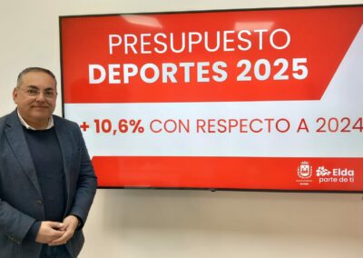 El Ayuntamiento de Elda ha aumentado un 10,6% el presupuesto de la Concejalía de Deportes para el año 2025, que alcanza los 973,896 euros, según ha informado esta mañana el concejal del área, Enrique Quílez. El edil ha destacado que «uno de los pilares de las políticas del gobierno local es el deporte, tal y como demuestra el hecho de que el presupuesto se ha incremento un 280% desde que accedimos al gobierno».