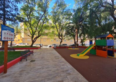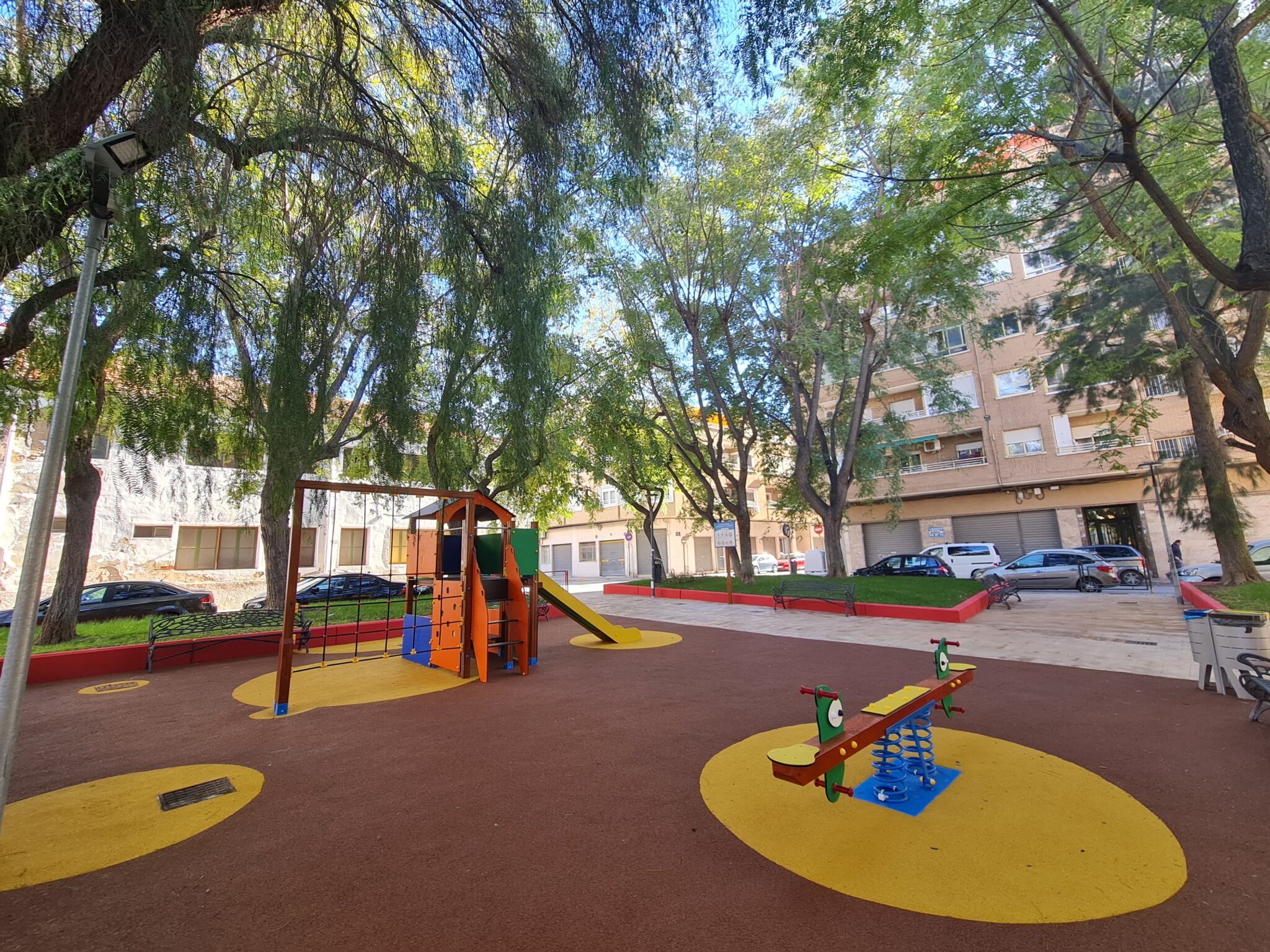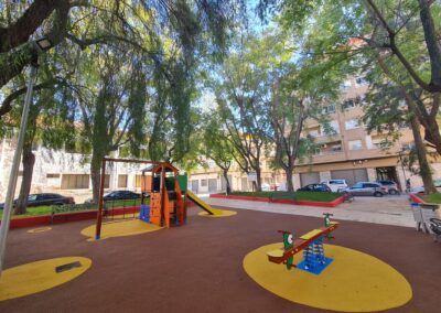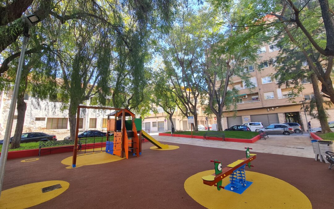 Del mismo modo, se ha procedido a la renovación integral tanto del caucho como de los juegos infantiles existentes en este emblemático parque situado en el centro del barrio, logrando un acabado uniforme y con el espesor necesario para que los niños y niñas del barrio puedan divertirse sin riesgo de accidentes. Además, la instalación de nuevo mobiliario infantil permitirá que los más pequeños disfruten de nuevo de este jardín, que cuenta con una gran vegetación para reducir el calor durante los días estivales.