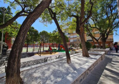 Del mismo modo, también se ha procedido a la restauración y pintado de los juegos infantiles, que si bien se encontraban en buen estado general contaban con alguna superficie más desgastada por el uso diario, mientras que en las zonas ajardinas se ha procedido al rellenado con tierra vegetal y grava blanca para obtener una superficie homogénea que proteja todas las raíces del arbolado existente en el entorno del jardín.