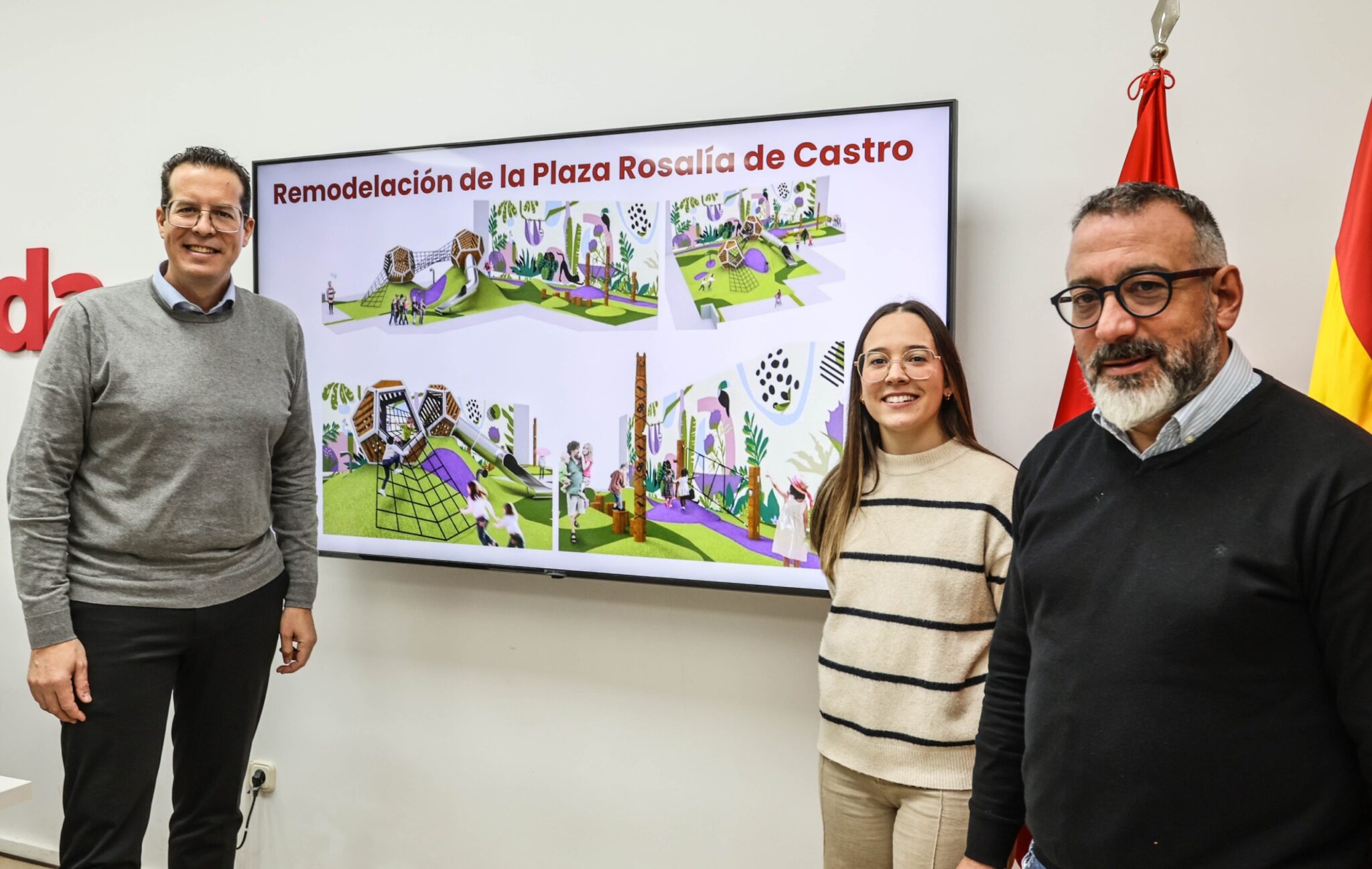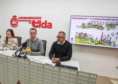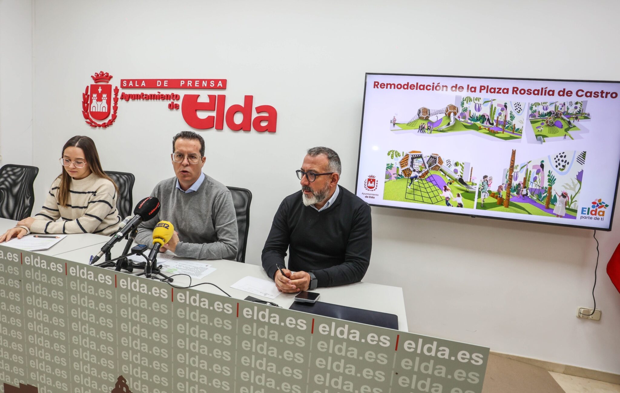 El alcalde de Elda, Rubén Alfaro, ha presentado esta mañana el proyecto de remodelación de la Plaza Rosalía de Castro, uno de los espacios más emblemáticos del barrio Nueva Fraternidad. El regidor eldense ha estado acompañado en la comparecencia por el concejal de Espacio Público e Inversiones, José Antonio Amat, y por la ingeniera del mismo departamento, María Abad.