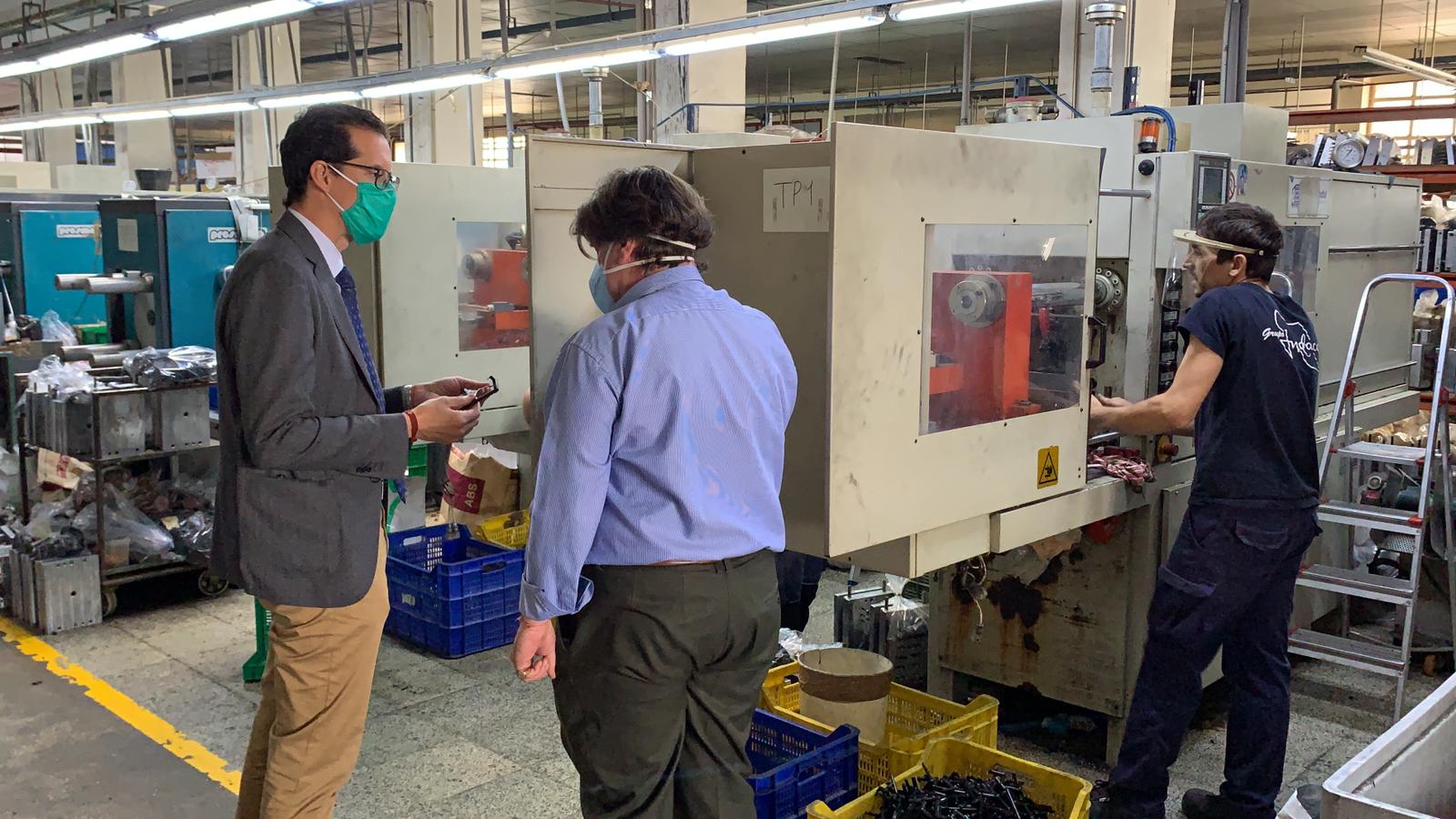 El alcalde de Elda, Rubén Alfaro, ha visitado esta semana las instalaciones de Indaca y “ha agradecido el compromiso y esfuerzo que esta empresa de nuestra ciudad ha realizado en las actuales circunstancias para adaptar sus líneas de producción, pasando de fabricar hormas, tacones y otros componentes del calzado a producir estas viseras que aportan un plus de seguridad”.