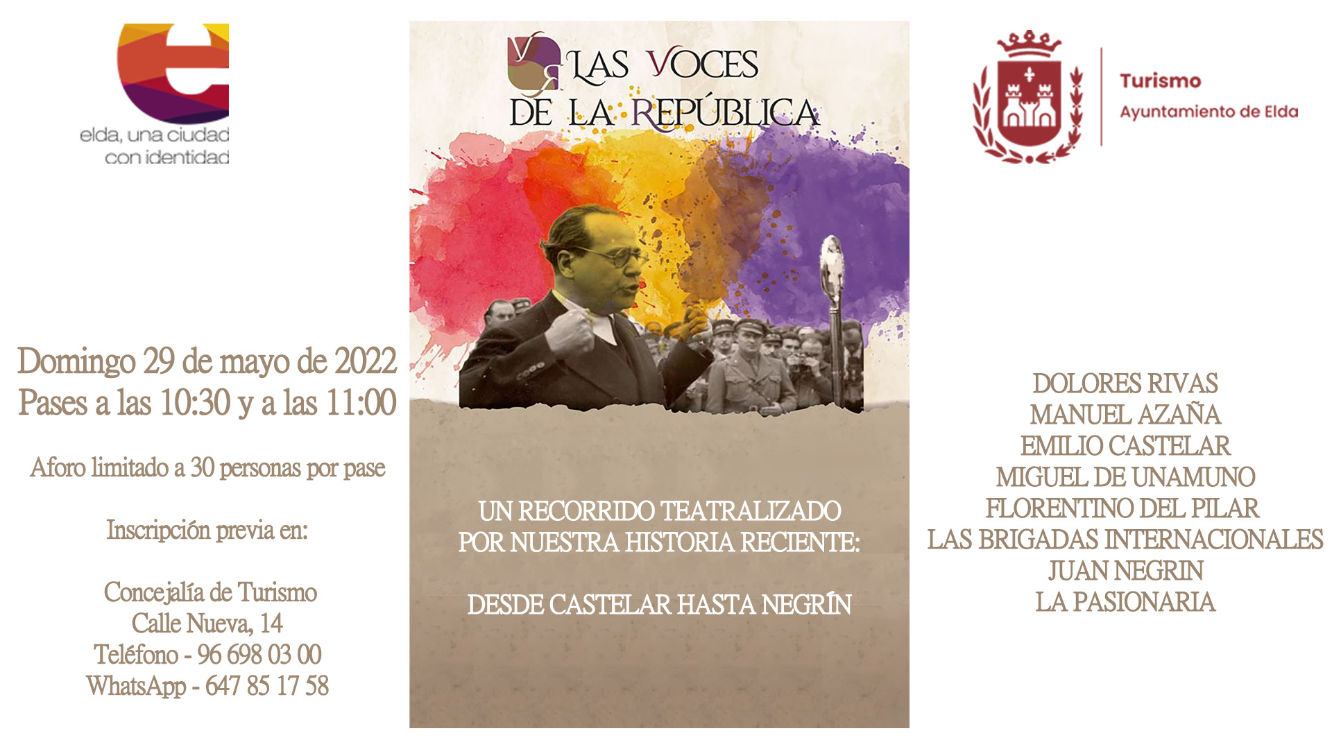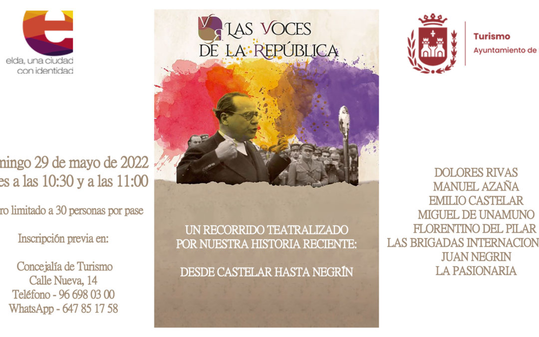 El Ayuntamiento de Elda, a través de la Concejalía de Turismo, retoma la experiencia turística teatralizada ‘Las Voces de la República’, tal y como ha anunciado esta mañana la concejala de Turismo, Rosa Vidal. La edil ha recordado que “se trata de una propuesta histórico-turística que abarca una etapa de la historia de España que arranca en el último cuarto del siglo XIX con Emilio Castelar, quien vivió en Elda durante su infancia, y concluye en 1939 con la salida del Gobierno de la República con destino a Francia”.