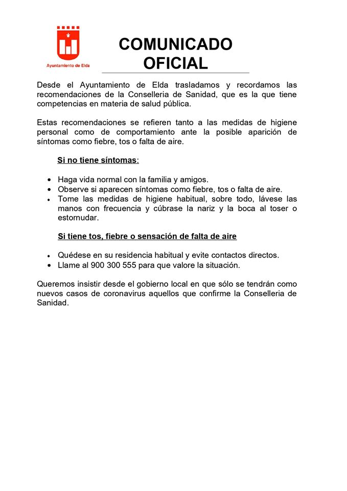 El Ayuntamiento de Elda, ante la evolución de la situación epidemiológica producida por la extensión del virus Covid-19, quiere transmitir en primer lugar un mensaje de tranquilidad y de confianza en las medidas adoptadas por las autoridades sanitarias de nuestro país.