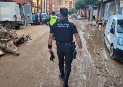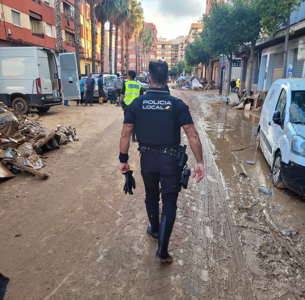 Por otra parte, los agentes de la Policía Local de Elda que participan en el operativo de seguridad en las localidades afectadas por la DANA continúan su labor de vigilancia y regulación del tráfico en el municipio de Sedaví, uno de los más afectados por las inundaciones del pasado martes.