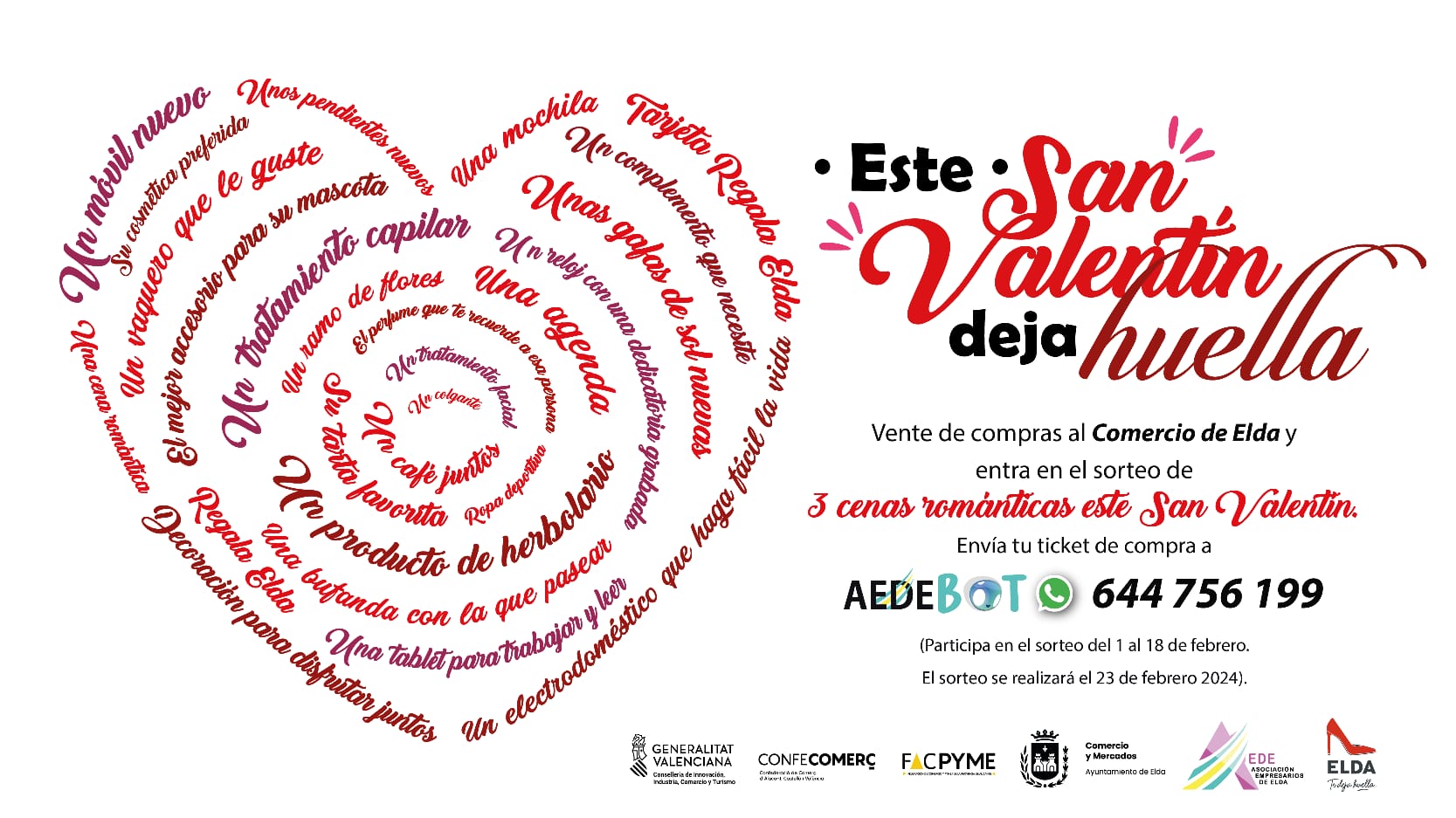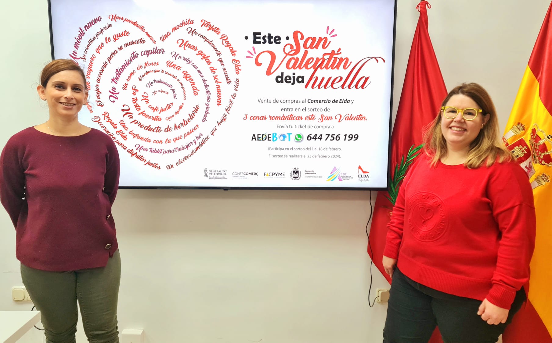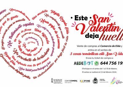 Por su parte, Rocío Vera ha explicado que «la campaña de San Valentín comienza hoy y consiste en un sorteo de tres cenas románticas en restaurantes asociados a AEDE. Para participar hay que enviar el ticket de compras realizadas en comercios de la asociación al teléfono 644 756 199 de AEDEbot. La campaña acaba el 18 de febrero y el sorteo se realizará el 23 de febrero».