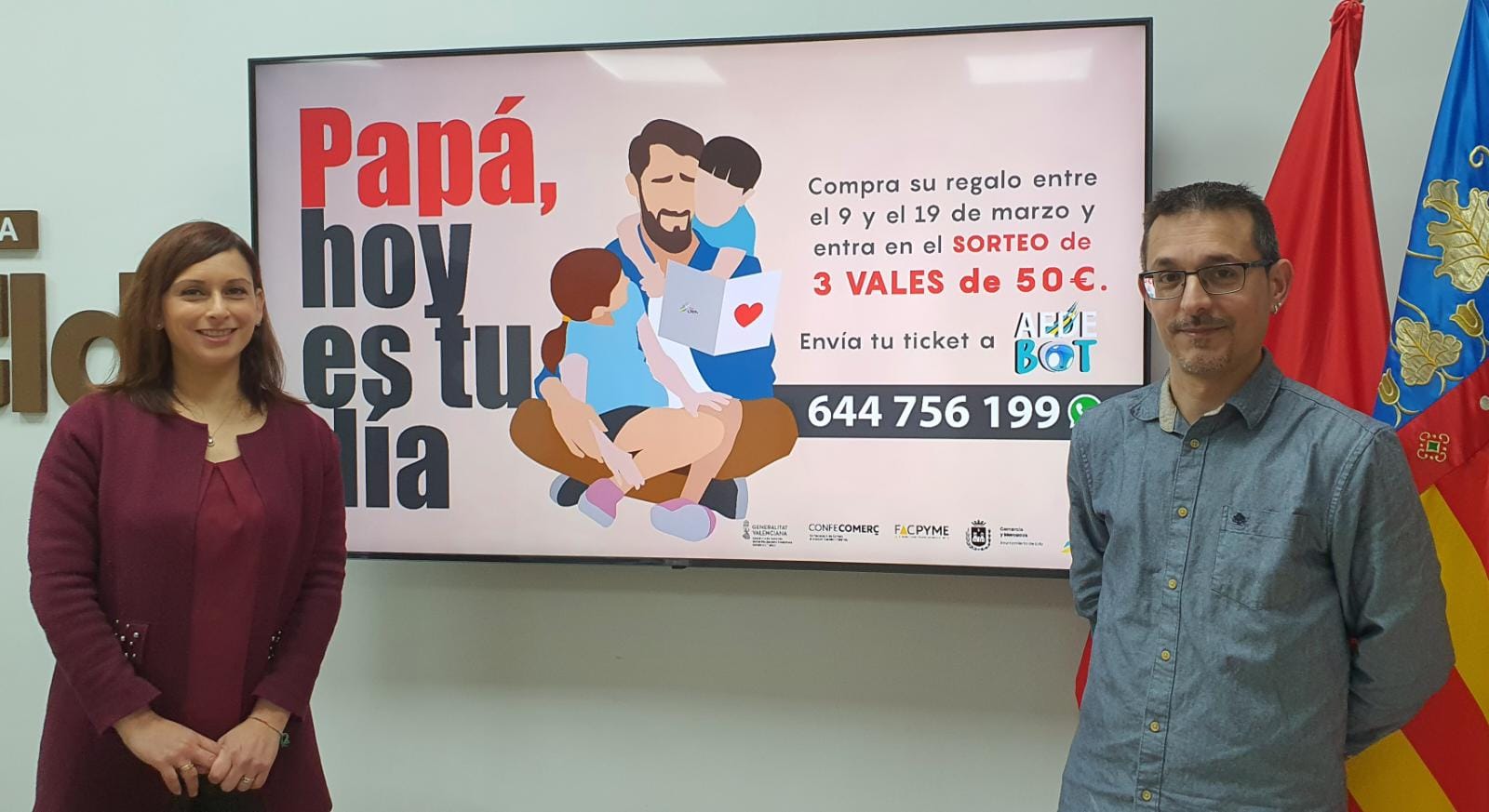 La concejala de Comercio y Mercado, Silvia Ibáñez, y el presidente de la Asociación de Empresarios de Elda (AEDE), Manuel Carpio, han presentado esta mañana la campaña que con motivo del Día del Padre han preparado para sus clientes los comercios adscritos a AEDE.