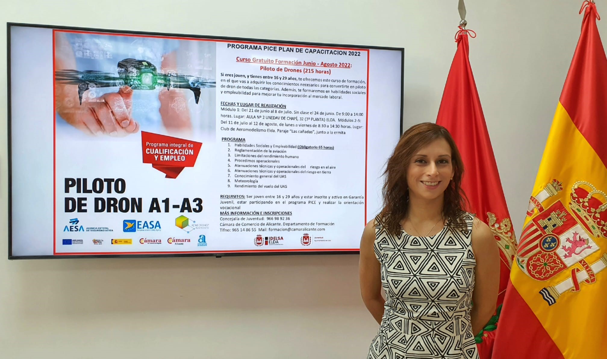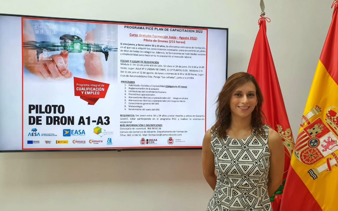 El Ayuntamiento de Elda, a través de Idelsa y de la Concejalía de Juventud, y la Cámara de Comercio de Alicante ofrecen un curso gratuito de piloto de dron dentro del Programa PICE-Plan de Capacitación 2022. La concejala de Fomento Económico, Industria y Empleo, Silvia Ibáñez, ha presentado hoy este curso “que está dirigido a jóvenes de entre 16 y 29 años que deseen adquirir conocimientos necesarios para convertirse en pilotos de dron de todas las categorías”.