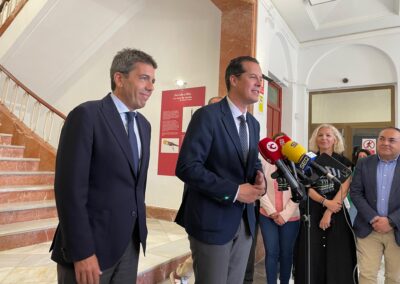 Rubén Alfaro ha agradecido a Carlos Mazón su visita a la ciudad «y el compromiso que tiene con nosotros. Es un encuentro de trabajo en el que hemos estudiado la situación de algunos inmuebles que hay en Elda y son de titularidad de la Generalitat, como es el caso de la Casa de la Juventud. He compartido con el President nuestra hoja de ruta con respecto al Castillo y al Centro Histórico».