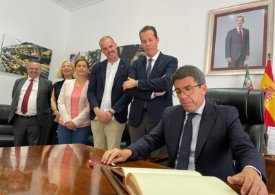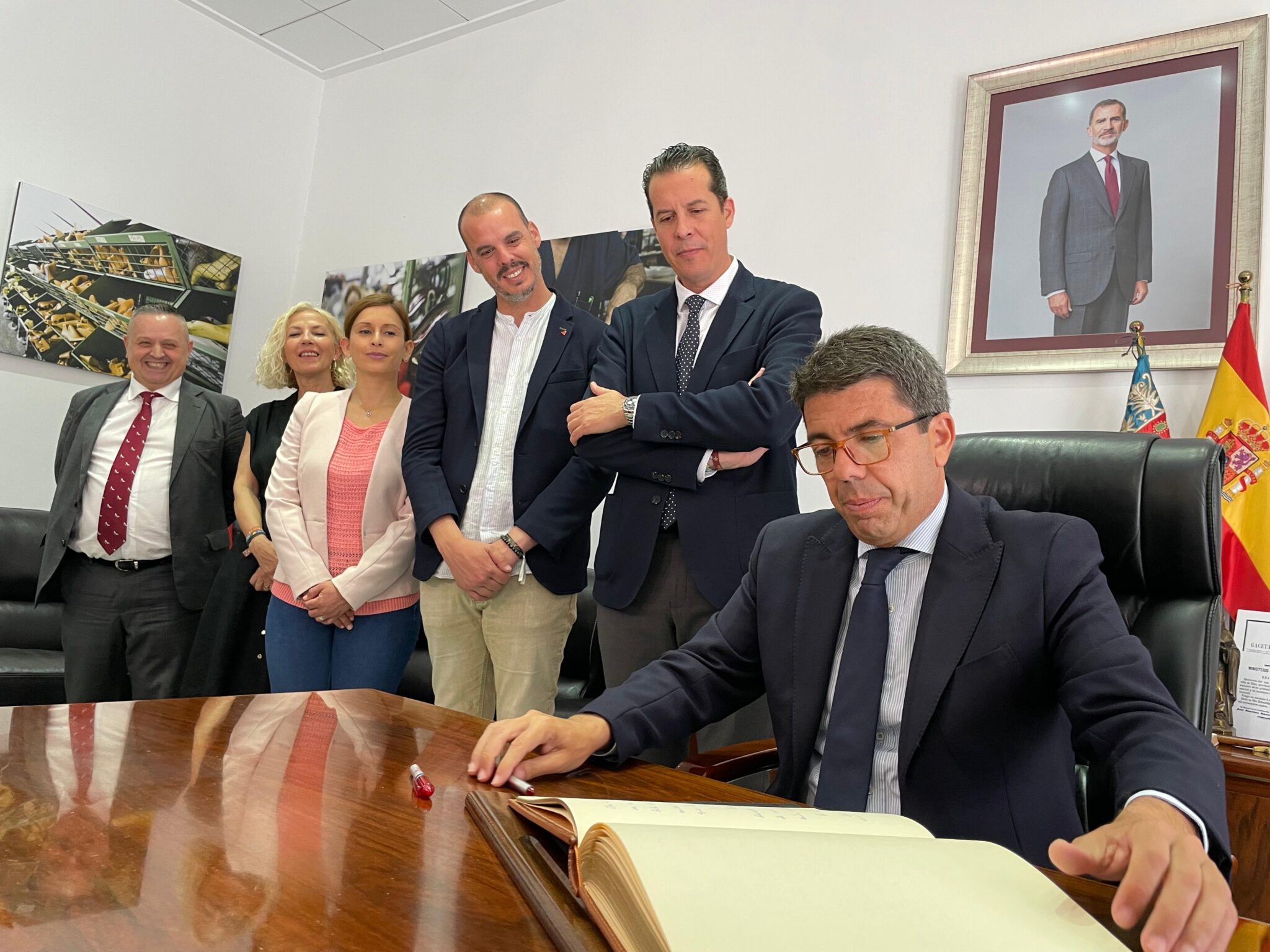 Antes de reunirse con Rubén Alfaro, Carlos Mazón ha sido recibido en las puertas del Ayuntamiento por miembros de todos los grupos municipales de la Corporación y, a continuación, ha accedido a Alcaldía, donde ha firmado en el Libro de Honor de la ciudad.