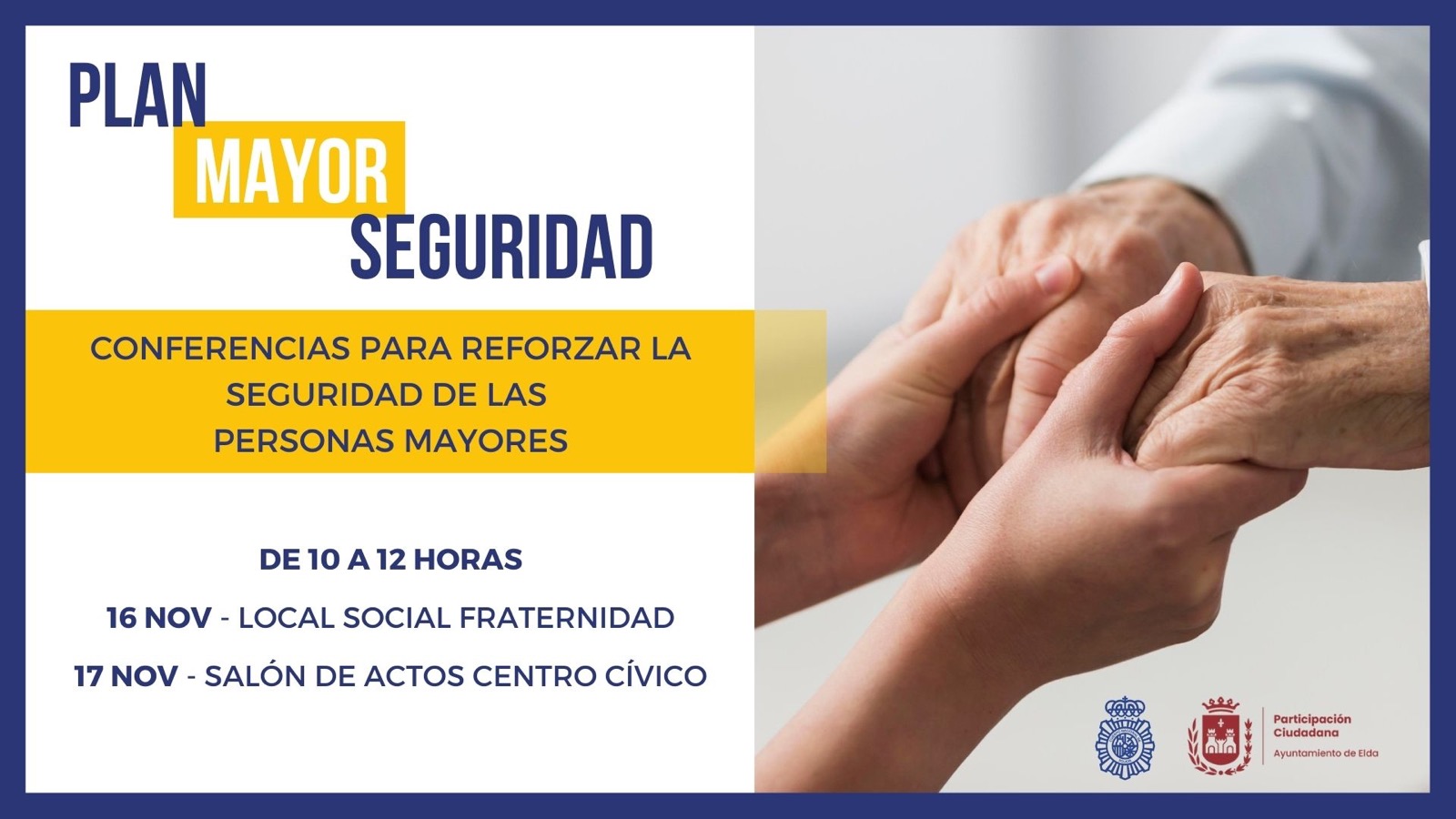 El Ayuntamiento de Elda, a través de la Concejalía de Participación Ciudadana, pone en marcha el Plan de Seguridad de Mayores que, junto al Departamento de Participación Ciudadana de la Policía Nacional, ofrecerá los días 16 y 17 de noviembre una serie de conferencias dirigidas a reforzar la seguridad de las personas mayores de Elda a través de los consejos de la Policía Nacional.