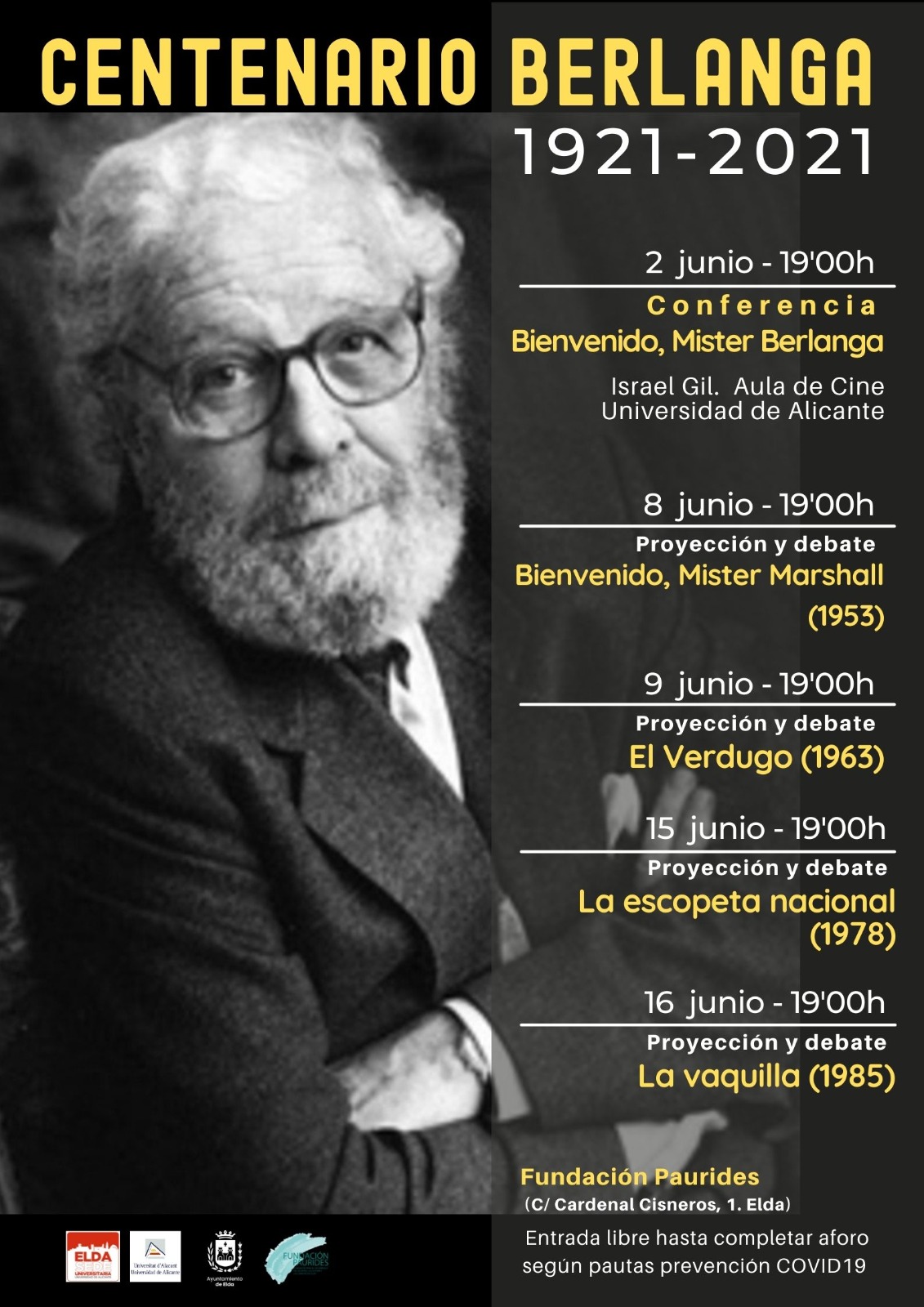 El Ayuntamiento de Elda y la Sede de la Universidad de Ailcante en Elda, en colaboración con la Fundación Paurides, organizan un ciclo de cine de Luis García Berlanga con motivo del centenario del nacimiento del cineasta valenciano. Berlanga cumpliría 100 años el próximo 12 de junio y, puesto que tuvo un vínculo estrecho con la ciudad de Elda, la Sede de la Universidad de Alicante y el Ayuntamiento de Elda han querido unirse a los actos para conmemorarlo.