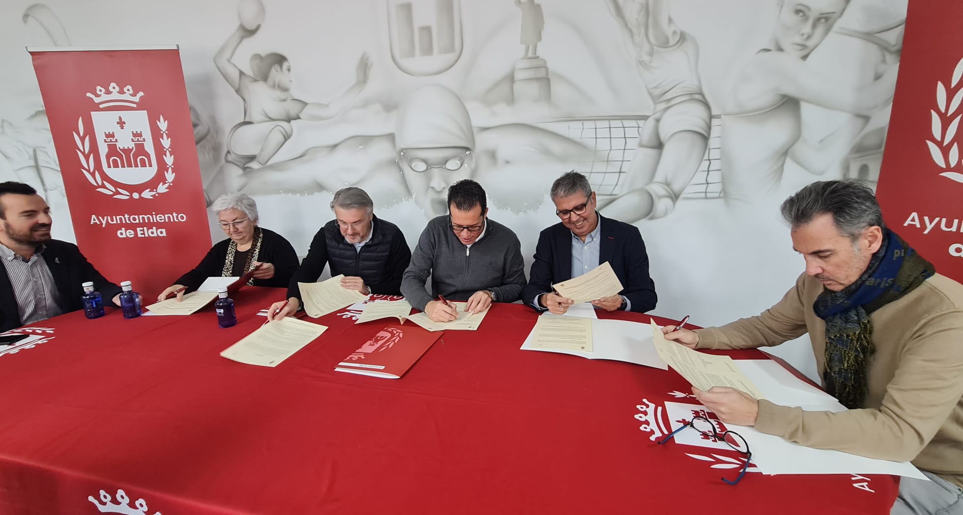 El alcalde de Elda, Rubén Alfaro, ha firmado esta mañana los convenios nominativos con los cuatro clubes deportivos de la ciudad que reciben una subvención del Ayuntamiento. El acto ha tenido lugar en la Concejalía de Deportes y ha contado con la presencia del concejal de Deportes, Fernando Gómez, y de los representantes de las cuatro entidades: José Antonio Castillo, directivo del C. D. Eldense; Manuel Pastor, presidente del CBM Elda Prestigio; Paqui Sánchez, presidenta del Nueva Elda F.S., y Rogelio García, presidente del Centro Excursionista Eldense.