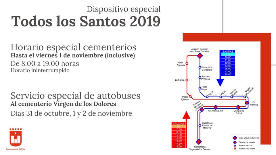 El Ayuntamiento de Elda, a través de la Concejalía de Transporte, ha establecido un dispositivo especial con motivo de la festividad de Todos los Santos. En concreto, se ha establecido un servicio especial de autobús al Cementerio Virgen de los Dolores del 31 de octubre al 2 de noviembre, ambos incluidos.