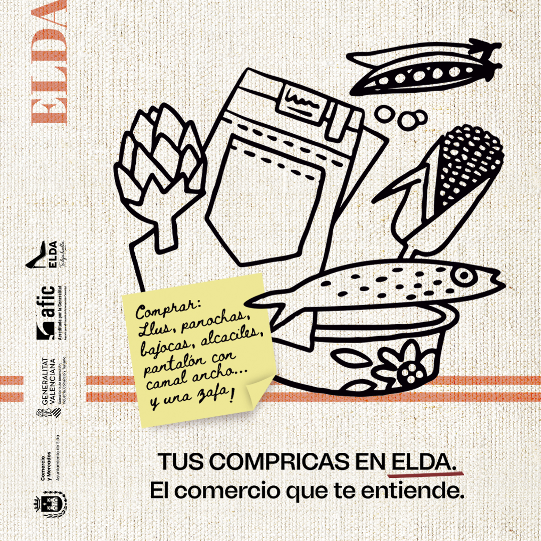 La campaña, que cuenta con el apoyo de la Conselleria de Innovación, Industria, Comercio y Turismo y se enmarca en la celebración del Día del Comercio Local, parte del eslogan ‘Tus compricas en Elda. El comercio que te entiende’ y de un diseño y creatividad en el que se han utilizado iconos y términos característicos del lenguaje eldense a modo de lista de la compra, destacando la identidad de lo propio.