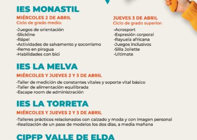 Igualmente, hay programadas dos charlas sobre el abuso del móvil y el fracaso escolar y sobre búsqueda de empleo. «Queremos agradecer a todos los institutos, entidades y profesionales que se implican en una iniciativa que es fundamental para que los jóvenes puedan tener más opciones de encontrar su camino aquí», ha concluido la edil.