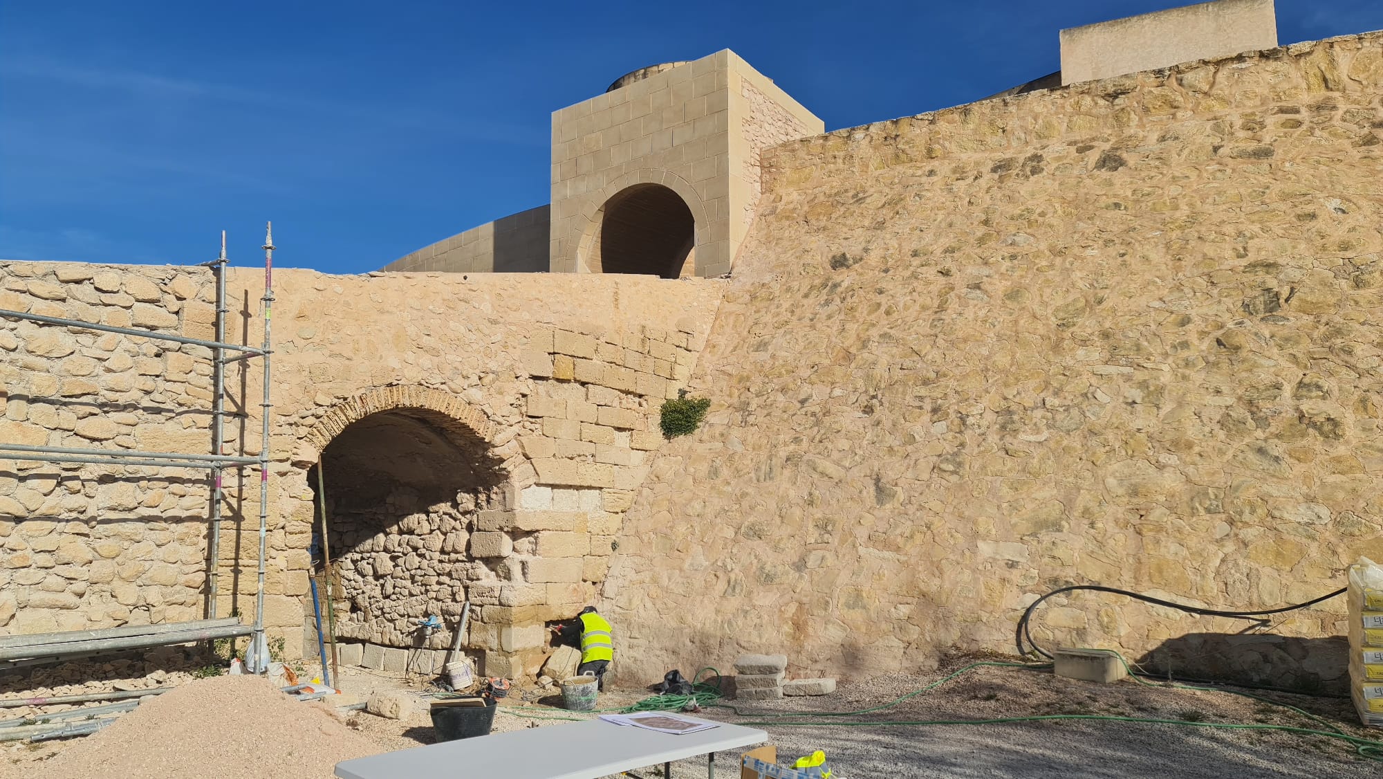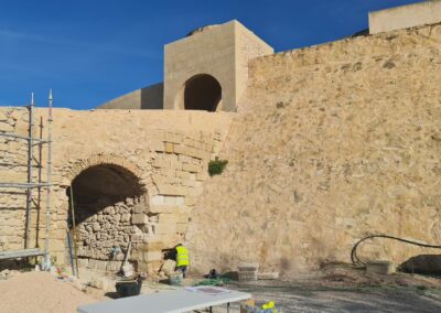 El regidor eldense ha explicado que «los trabajos que se están realizando permitirán actuar sobre los pavimentos de la rampa de la barbacana, la estructura que da acceso al castillo y, sobre todo, la restauración del arco de acceso entre la calle Virtudes y la antigua plaza del Castillo».