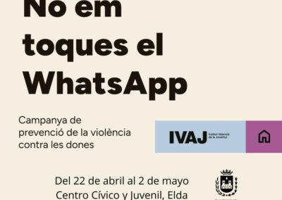 El IVAJ organiza anualmente, con motivo del Día Internacional para la Eliminación de la Violencia contra las Mujeres, el 25 de noviembre, el concurso de fotografía ‘No me toques el Whatsapp’. Está dirigido a jóvenes de entre 14 y 30 años. La exposición que llega a Elda reúne las fotografías seleccionadas y que son cedidas a ayuntamientos, asociaciones y otras entidades interesadas en trabajar, con niños, niñas y adolescentes, la prevención de actitudes violentas.