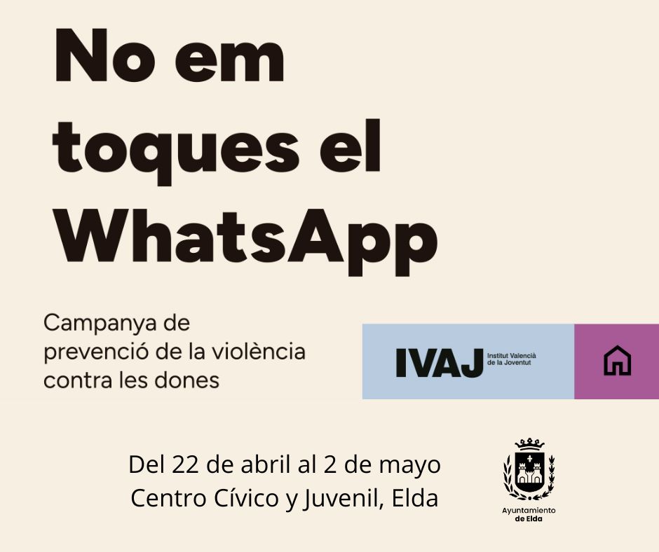 El Centro Cívico y Juvenil acoge desde hoy y hasta el próximo 2 de mayo la exposición ‘No me toques el Whatsapp’, una muestra organizada por el Instituto Valenciano de la Juventud (IVAJ). El objetivo de esta exposición, que consta de diferentes paneles de 170×70 cms, es sensibilizar y concienciar principalmente a la juventud sobre la importancia de conocer y saber detectar la violencia de género. La muestra se puede visitar todos los días de la semana, por las mañanas y por las tardes.