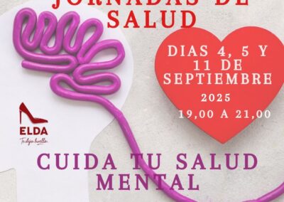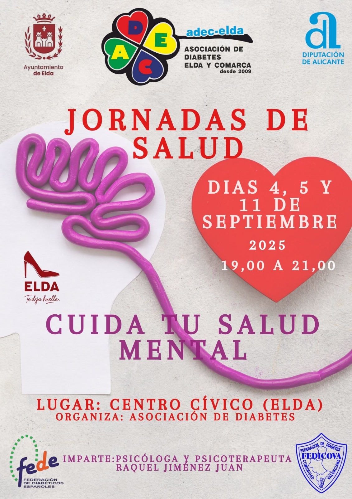 El Centro Cívico y Juvenil acogerá los días 4, 5 y 11 de septiembre las jornadas ‘Cuida tu salud mental’, organizadas por la Asociación de Diabetes de Elda y Comarca (ADEC-Elda), con el apoyo del Ayuntamiento de Elda y la Diputación de Alicante.
