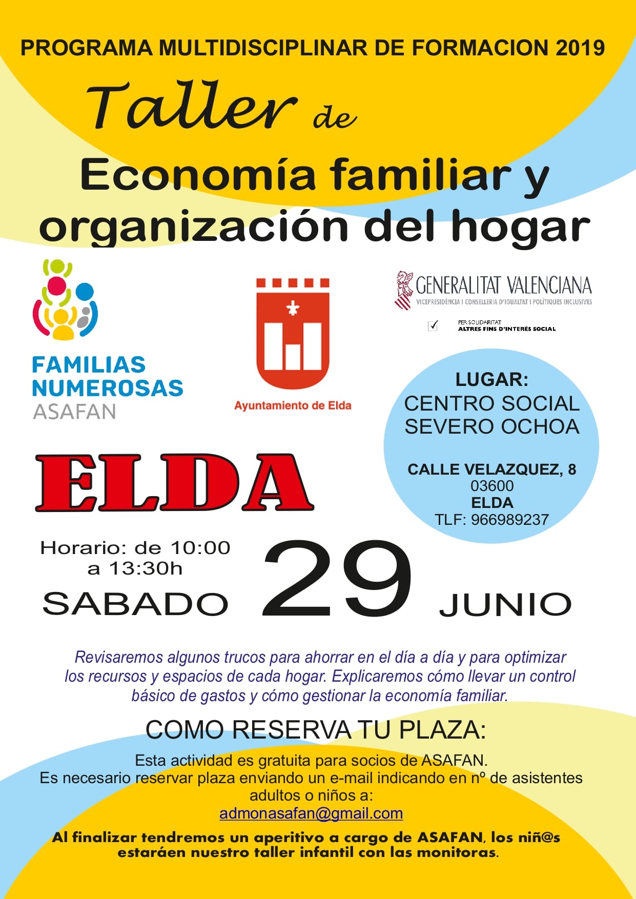 La Asociación Alicantina de Familias Numerosas (Asafan) ha organizado, en colaboración con la Concejalía de Bienestar Social del Ayuntamiento de Elda, un taller de economía familiar y organización del hogar que tendrá lugar este sábado 29 de junio, de 10 a 13 horas, en el Centro Social Severo Ochoa. En esta actividad se ofrecerán diferentes claves para que las familias numerosas mejoren su economía a través del ahorro o realizando compras más económicas, entre otros aspectos.