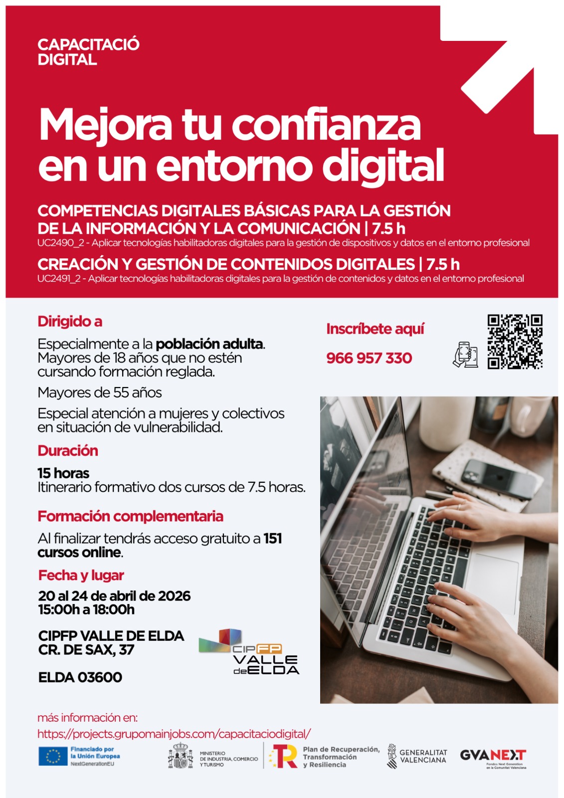 Este programa de capacitación digital cuenta con la financiación de los fondos europeos ‘Next Generation’, canalizados a través del Ministerio de Industria, Comercio y Turismo y la Generalitat Valenciana, demostrando la eficacia de la colaboración entre administraciones para acercar la innovación a pie de calle. Las inscripciones pueden realizarse en las dependencias del CIPFP Valle de Elda y a través del enlace https://projects.grupomainjobs.com/capacitaciodigital/