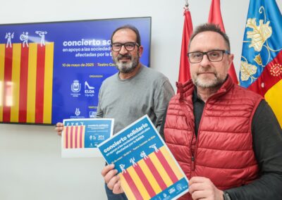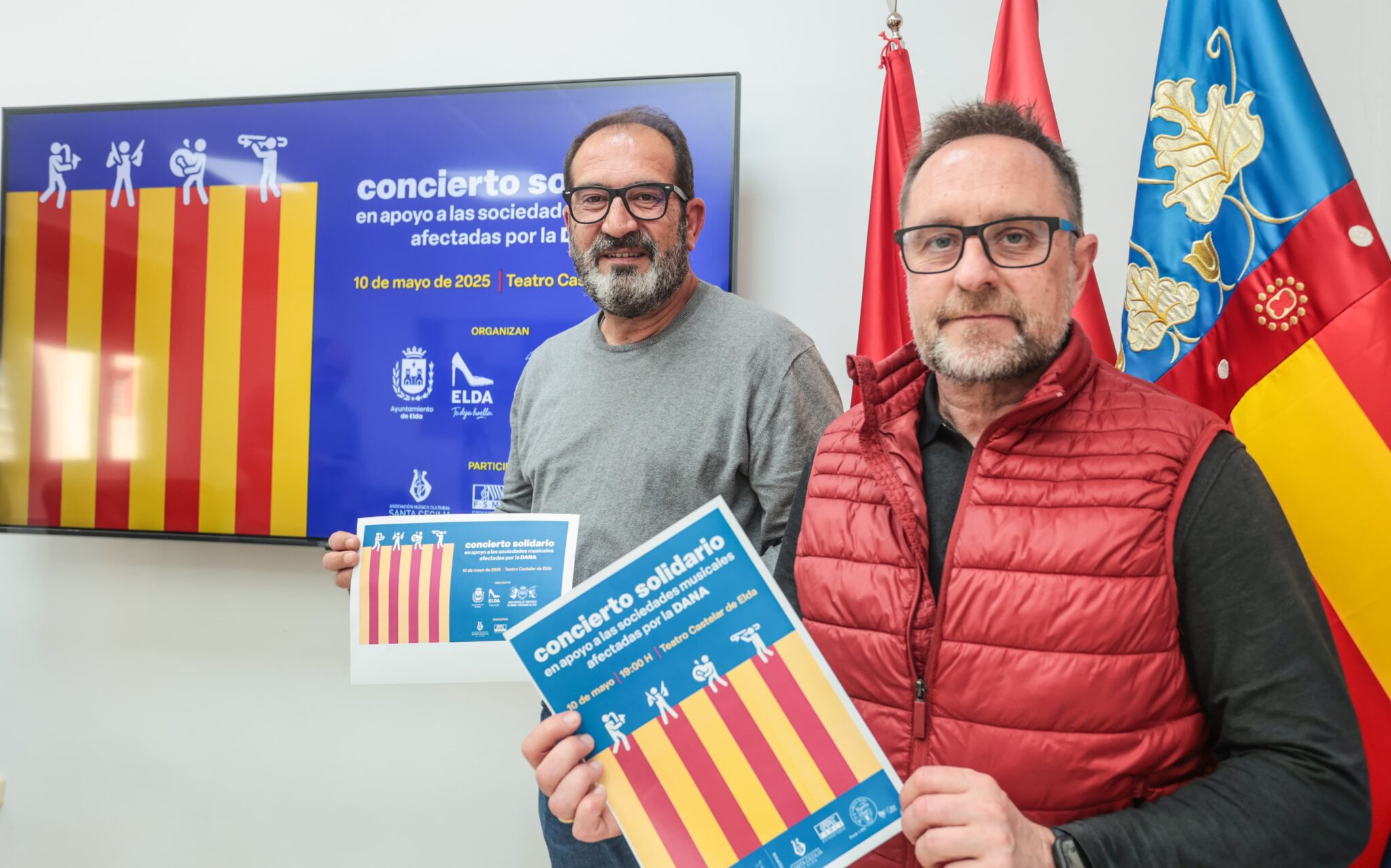 El concejal de Fiestas, David Guardiola, y el presidente de la Junta Central de Comparsas de Moros y Cristianos de Elda, Pedro Serrano, han dado a conocer los detalles de un concierto que sustituye al Certamen de Música Festera, cancelado este año a causa de las graves inundaciones sufridas por numerosos municipios de la provincia de Valencia.