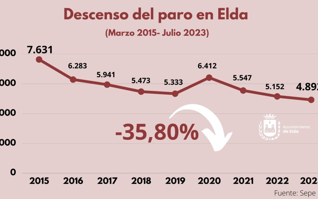 De julio de 2022 a julio de 2023 el número de desempleados en Elda se ha reducido en 435 personas, consolidándose en los níveles más bajos desde el verano de 2017. La cifra total de desempleados, que en junio bajó por primera vez de la barrera de las 5.000 personas, se ha situado ya por debajo de las 4.900 después de que en julio haya bajado en 30 personas el número de inscritos en la oficina de empleo.