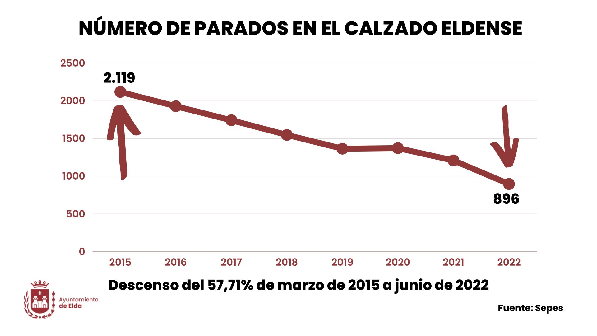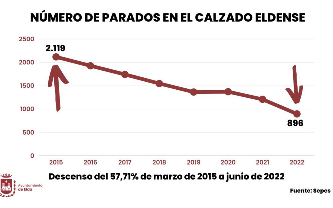 El número de desempleados en la industria del calzado eldense sigue bajando con fuerza y se consolida en los niveles más bajos de los últimos siete años, un periodo de tiempo en el que la cifra total se ha reducido más de la mitad.
