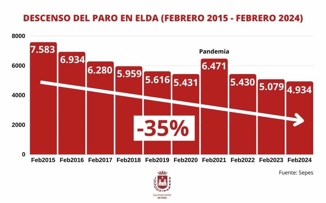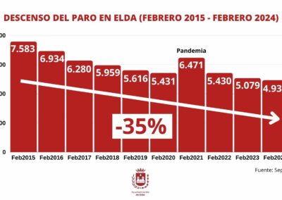 El número total de desempleados en Elda se sitúa en las 4.934 personas, la quinta cifra más baja desde que hay registros oficiales, tras descenderen 38 el número de inscritos en la oficina de empleo en febrero. En los últimos doce meses (de febrero de 2023 a febrero de 2024) el número de parados ha pasado de 5.079 a 4.934, lo que supone una bajada del 2,85%.