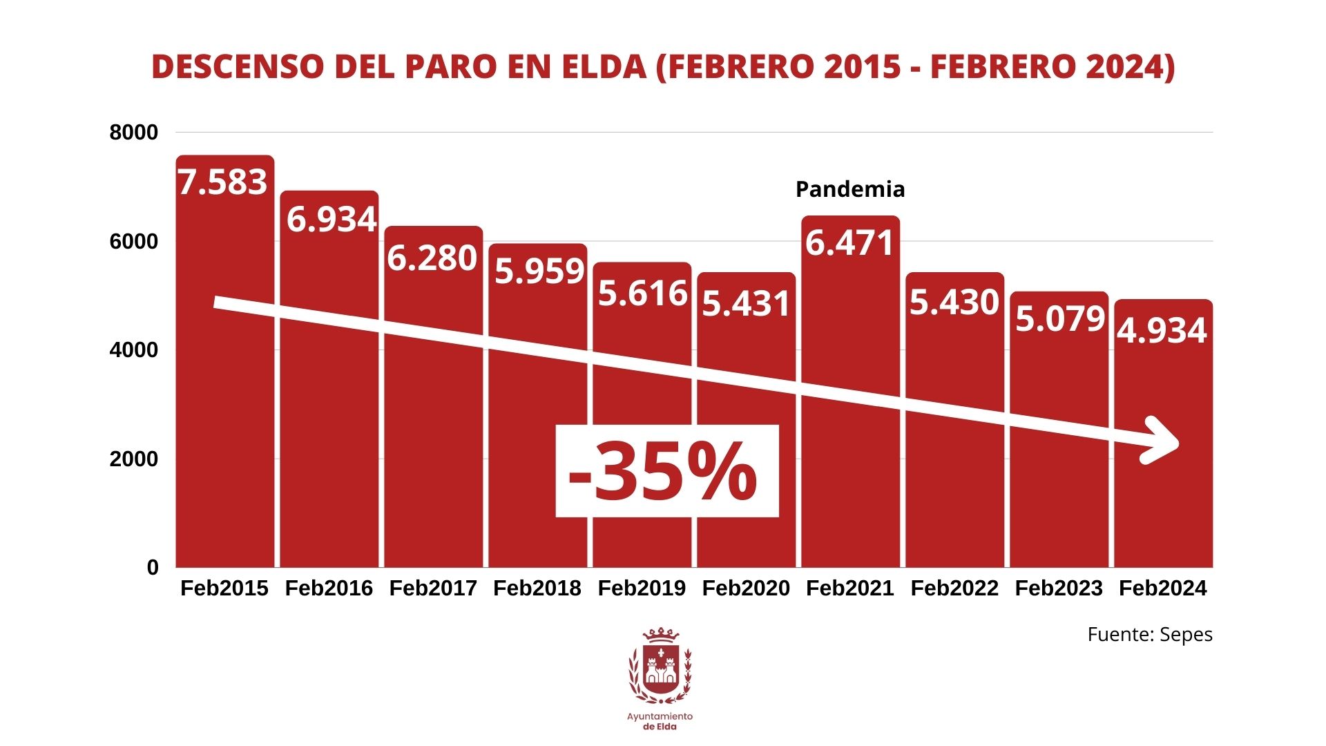 La evolución del paro en Elda desde 2015, año en el que accedió Rubén Alfaro a la Alcaldía de la ciudad, ha sido de descenso continuo, pasando de las 7.583 personas sin trabajo del aquel año a las 4.934 de la actualidad, lo que equivale a una caída del 35% en diez años.