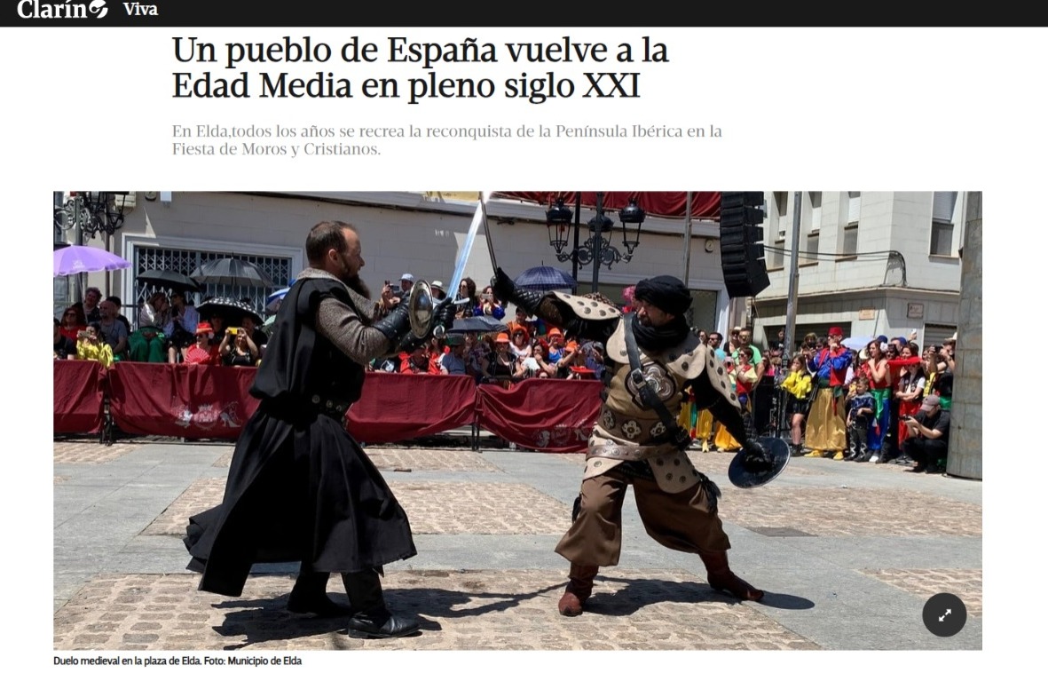 El diario argentino Clarín, uno de los más importantes del país, ha recogido en sus páginas un artículo dedicado a la fiesta de Moros y Cristianos de Elda. El reportaje hace un resumen de qué sucede en la ciudad durante los días de Moros y Cristianos y explica que la fiesta se basa en la recreación de la reconquista de la Península Ibérica, destacando que Elda vuelve a la Edad Media en pleno siglo XXI.