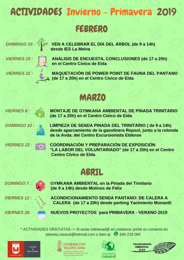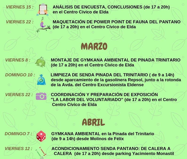 El Grupo de Voluntariado Medioambiental de Elda ha presentado las actividades que realizarán en los meses de Febrero, Marzo y Abril del año 2019. Excursiones o yincanas son solo algunas de las tareas que se llevarán a cabo.