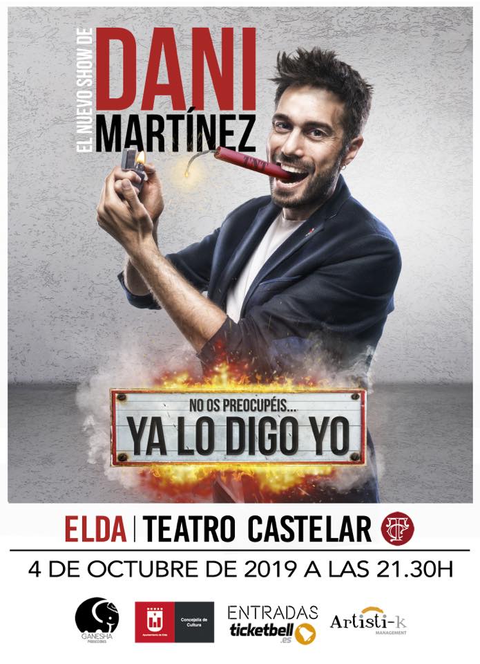 El humorista y presentador Dani Martínez visitará el Teatro Castelar con su nuevo show titulado ‘No os preocupéis … Ya lo digo yo’. La improvisación, las imitaciones y la música protagonizan este innovador monólogo que el conocido cómico y presentador representará el 4 de octubre a las 21:30 horas.