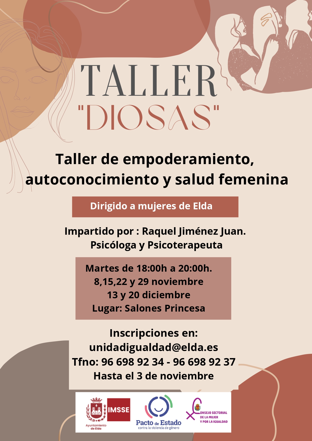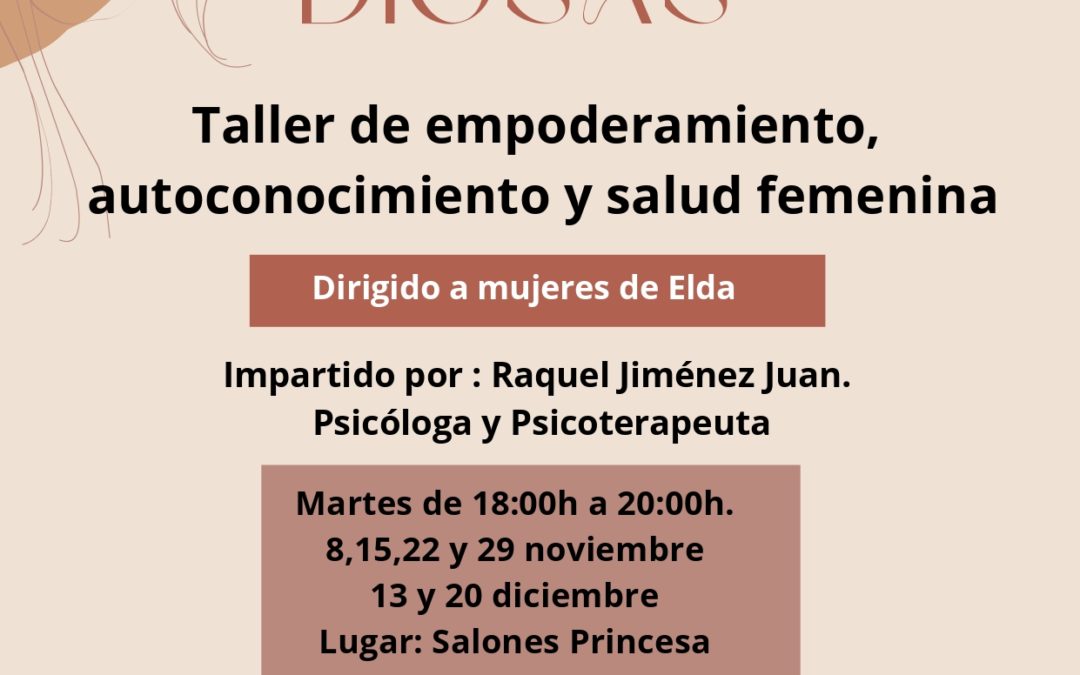 El Instituto Municipal de Servicios Sociales de Elda (IMSSE), a través de la Unidad de Igualdad, ha programado el Taller ‘Diosas’, un taller dirigido a las mujeres de Elda en el que, por medio de diferentes actividades dirigidas por Raquel Jiménez Juan, psicóloga y psicoterapeuta, con formación en igualdad y prevención de la violencia de género, se abordará el empoderamiento, el autoconocimiento y la salud femenina.
