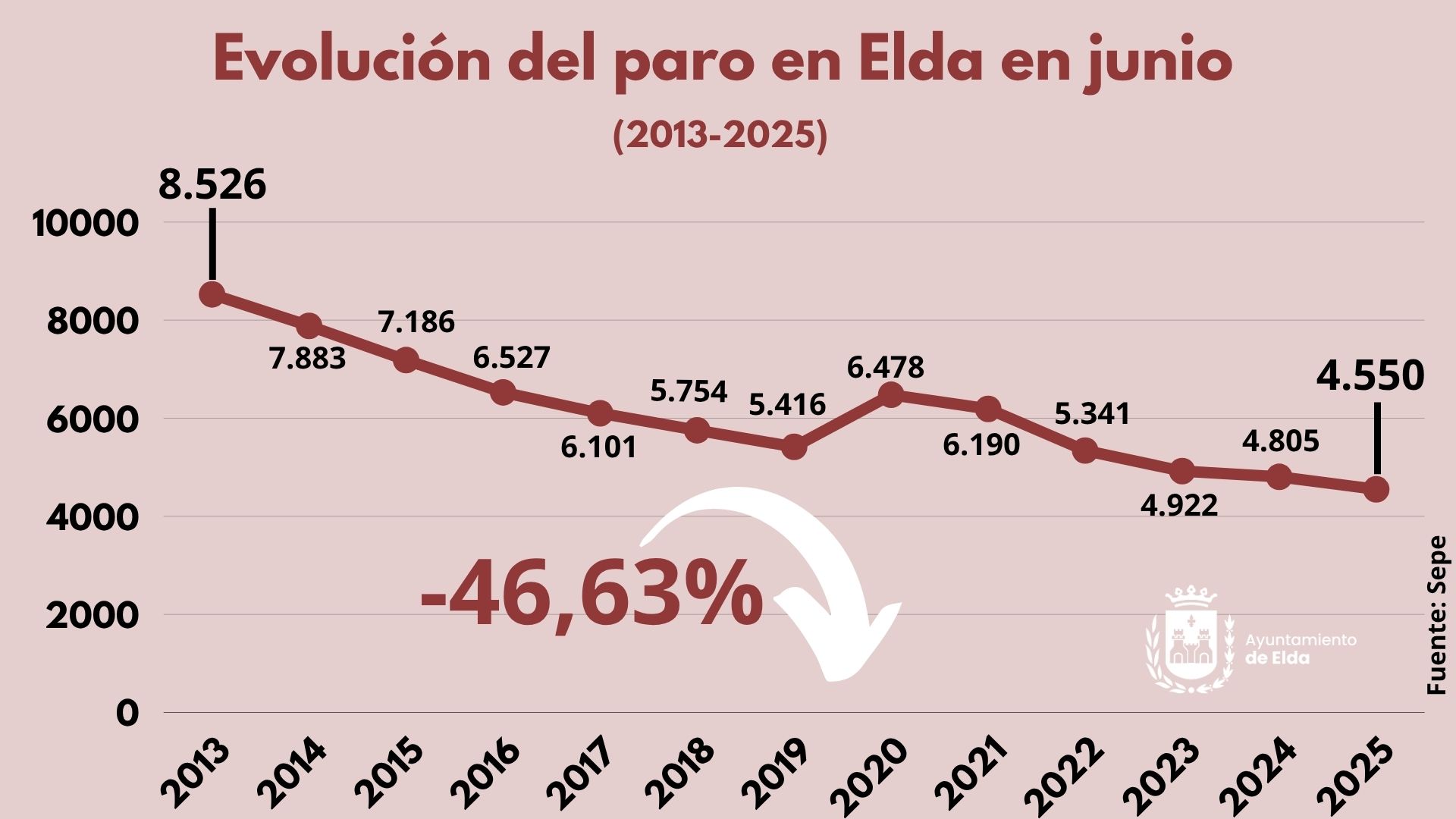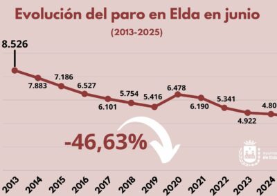 El mercado laboral de Elda mantiene su fortaleza y en el mes de junio volvió a marcar un nuevo récord de reducción del paro. El sexto mes del año terminó con 41 desempleados menos, quedando la cifra total en 4.550 personas tras sumar siete meses consecutivos de bajadas. En lo que va de año, el paro ha bajado en 272 personas, lo que supone una caída del 5,64% en los seis primeros meses del año.