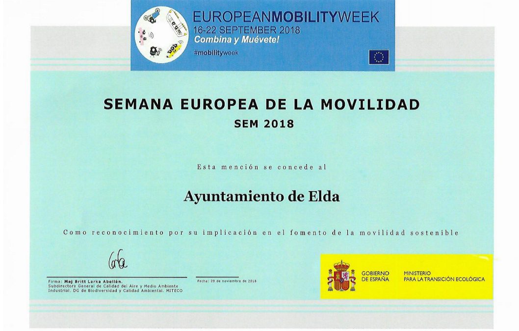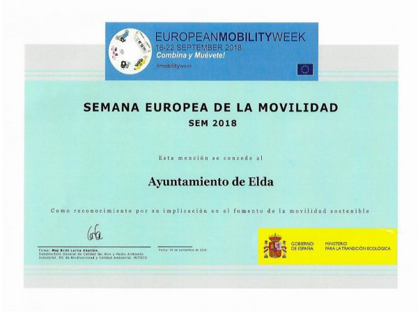 El Ministerio para la Transición Ecológica ha reconocido el trabajo del Ayuntamiento de Elda en pos de una movilidad más sostenible, segura y amable con los ciudadanos por su participación en la Semana Europea de la Movilidad.