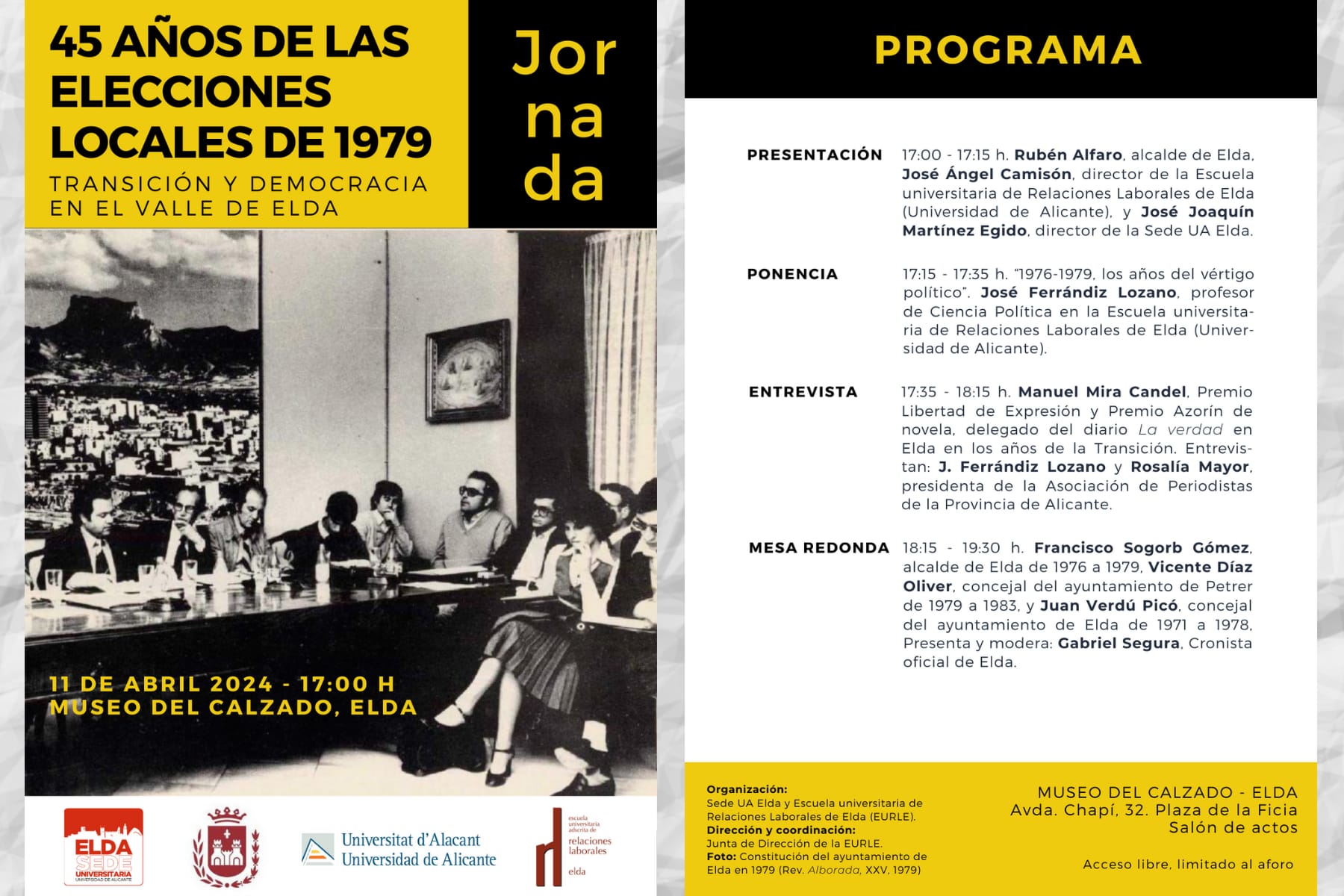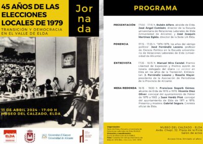 Por último, la jornada se cerrará con una mesa redonda en la que tomarán parte Francisco Sogorb, alcalde de Elda entre 1976 y 1979; Vicente Díez, concejal del Ayuntamiento de Petrer en esas fechas; Juan Verdú Picó, concejal del Ayuntamiento de Elda entre 1971 y 1978. La mesa redonda será moderada por Gabriel Segura, cronista oficial de Elda.
