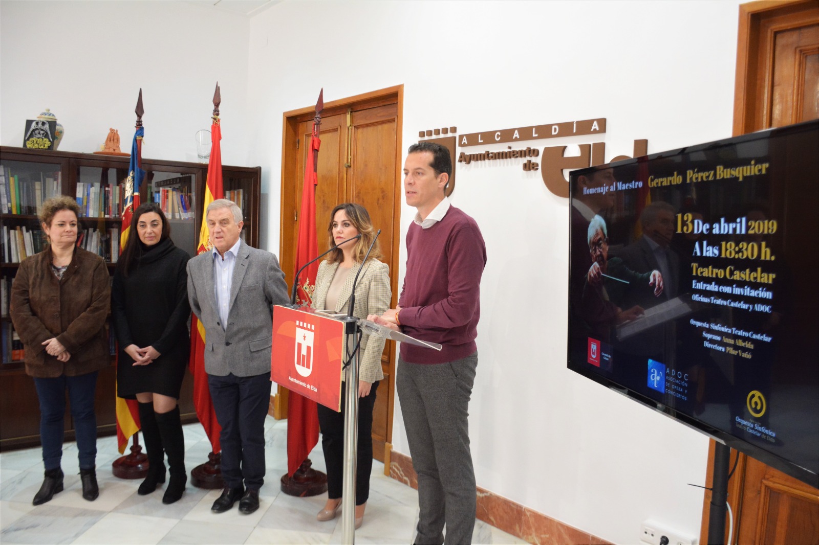 Para presentar este evento, el alcalde de Elda, Rubén Alfaro, ha estado acompañado de Pilar Vañó, Directora de Orquesta, de Francis Valero de la Asociación ADOC, de Ana Albelda, soprano y familiar de Gerardo Pérez, así como de la concejala de Cultura, Nieves López.