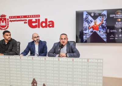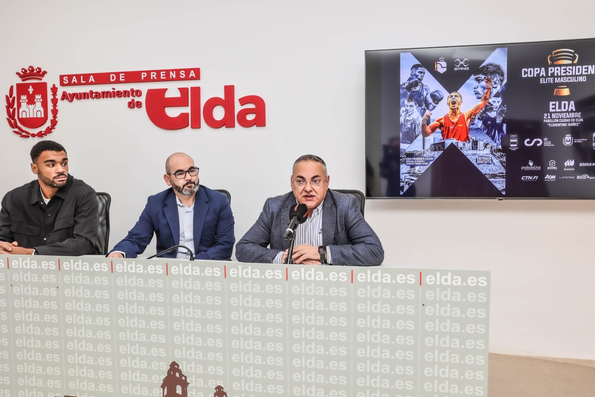 El Pabellón Florentino Ibáñez-Ciudad de Elda acogerá el próximo 21 de noviembre a partir de las 20:00 horas, una nueva edición de la Copa Presidente de boxeo, en la que participarán los mejores púgiles de España. El concejal de Deportes, Enrique Quílez, acompañado por el presidente de la Federación Española de Boxeo, Felipe Martínez, y del boxeador eldense Pablo Coy.