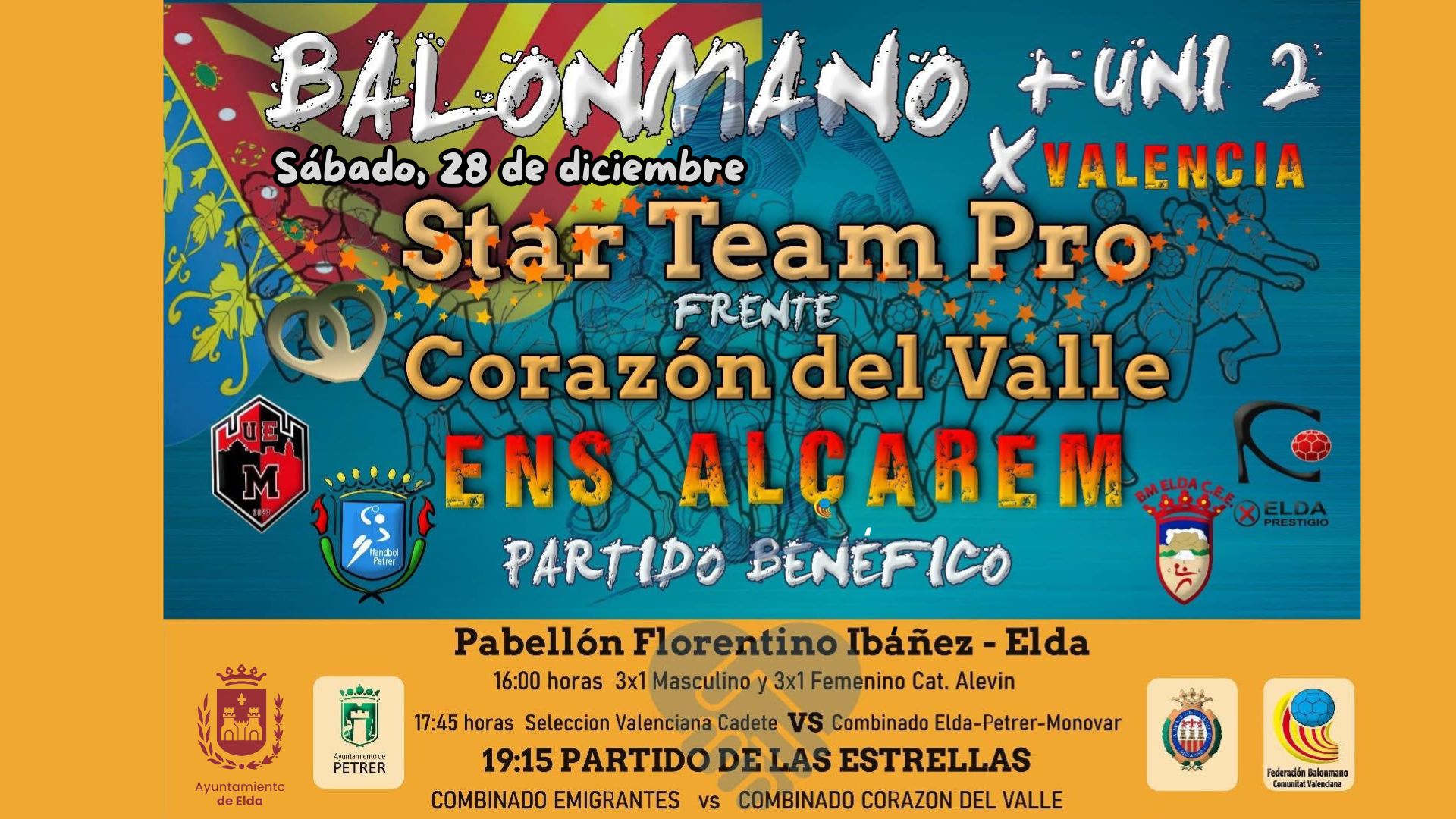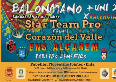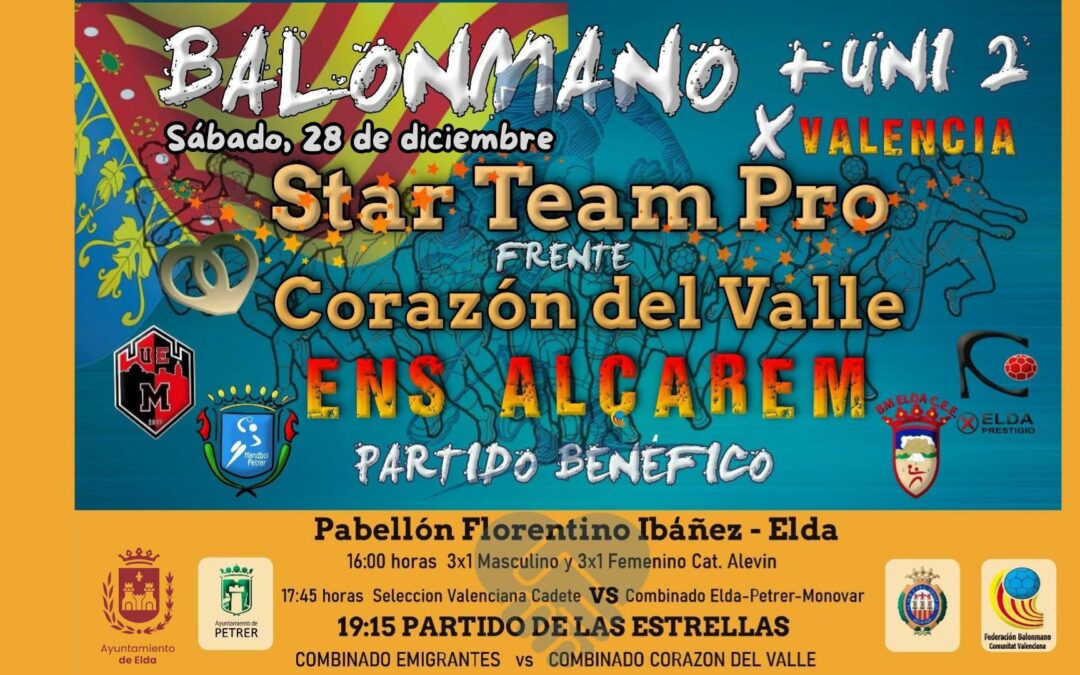 El ‘plato fuerte’ de la jornada comenzará a las 19:15 horas con un encuentro amistoso entre un combinado de jugadores profesionales que militan en clubes de la Liga Asobal contra un combinado de jugadores del Centro Excursionista Eldense, CBM Petrer y Unió Esportiva Monòver.