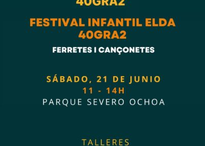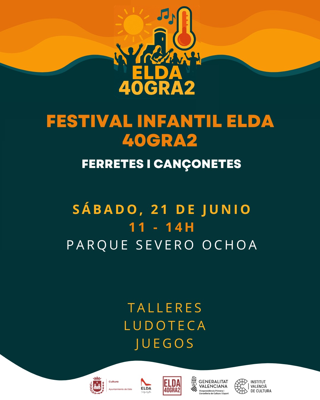 El Ayuntamiento de Elda, a través de la Concejalía de Cultura, ha organizado una jornada lúdica para los más pequeños dentro del programa estival Elda 40Gra2. Este sábado, 21 de junio, el parque Severo Ochoa será el escenario del Festival Infantil 40Gra2, que se celebrará de 11:00 a 14:00 horas.