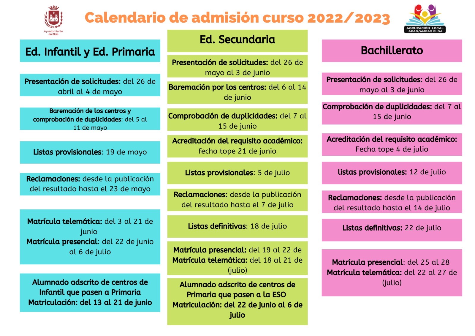 El Ayuntamiento de Elda, a través de la Concejalía de Educación, ultima los detalles del periodo de matriculación en los centros educativos eldenses para el curso 2022-23. Todo el proceso, como en cursos anteriores, se realizará de manera telemática, aunque en cada centro se habilitará un espacio para las familias que carezcan de medios o tengan dificultades para realizar los trámites por internet.