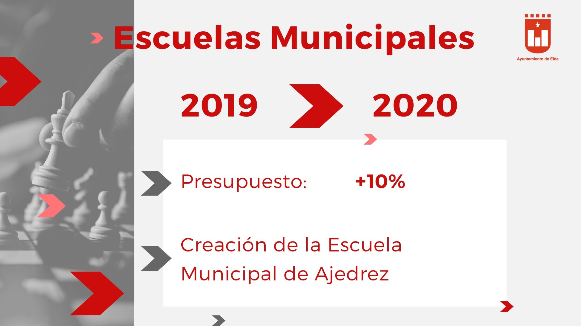 En relación a las escuelas deportivas municipales, Gómez ha explicado que “se creará la Escuela Municipal de Ajedrez, ampliando la oferta como ya se hizo en la anterior legislatura con la incorporación de Higiene Postural, Tai Jitsu, y la ampliación de clases de Mantenimiento Físico. El presupuesto para las escuelas asciende a 92.185 euros, lo que supone un 10% más que en 2019. Además, la partida para la Escuela de Verano asciende hasta los 56.000 euros”.